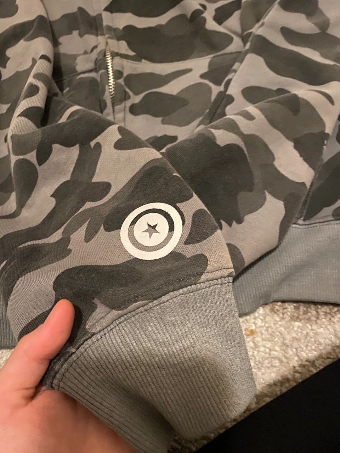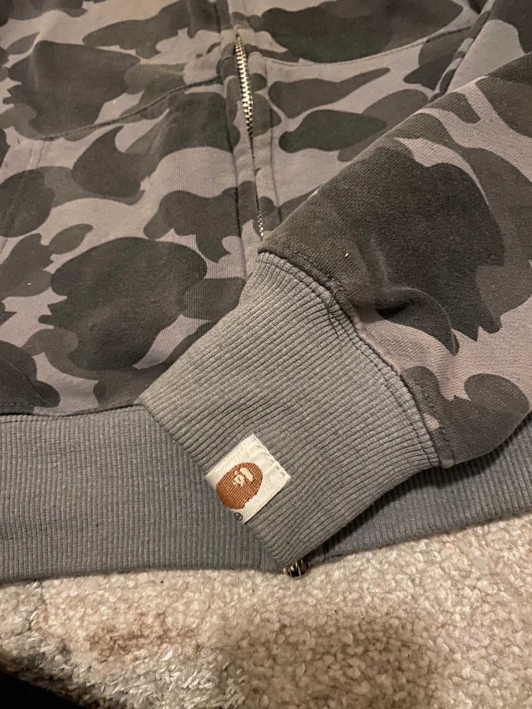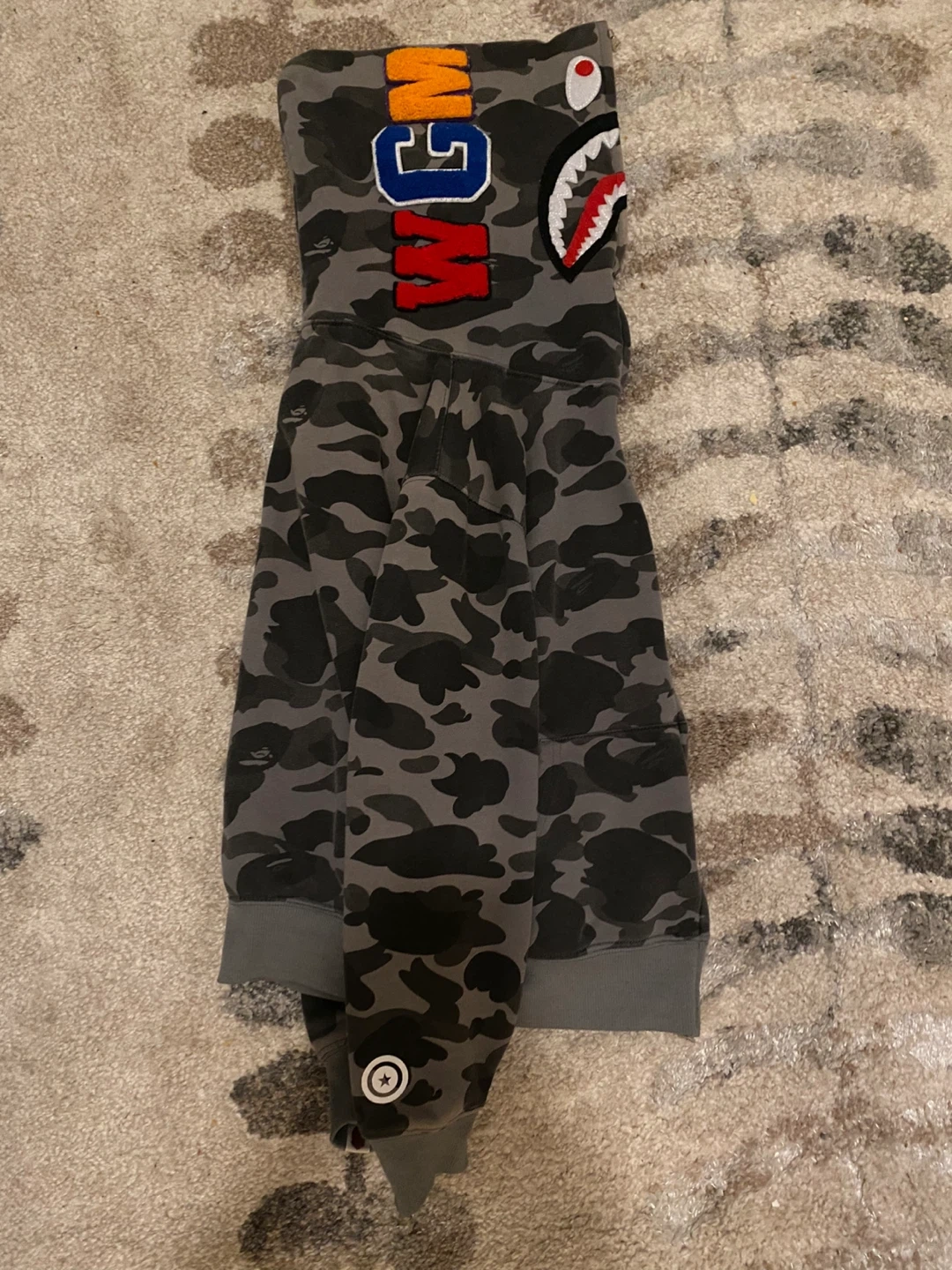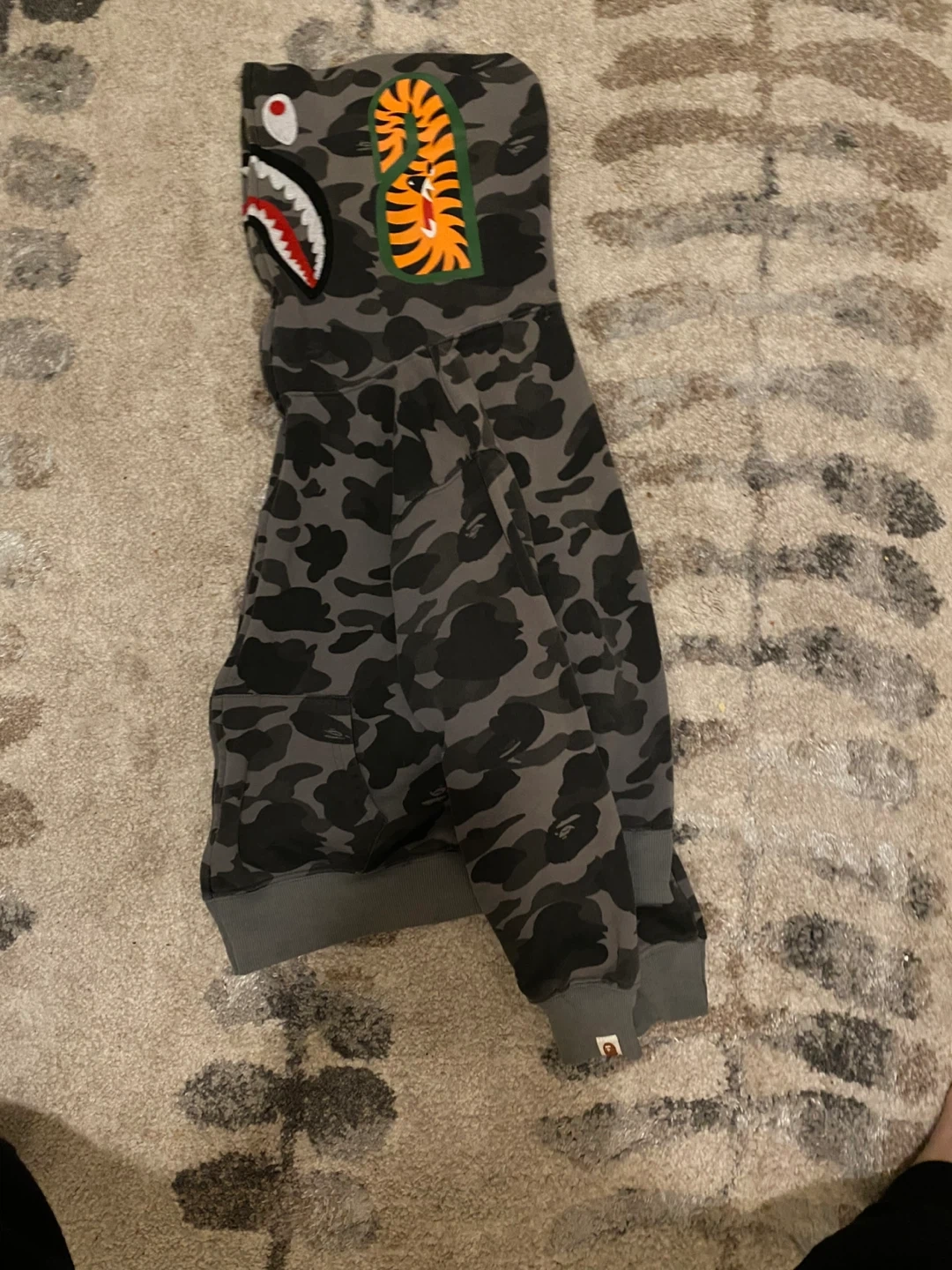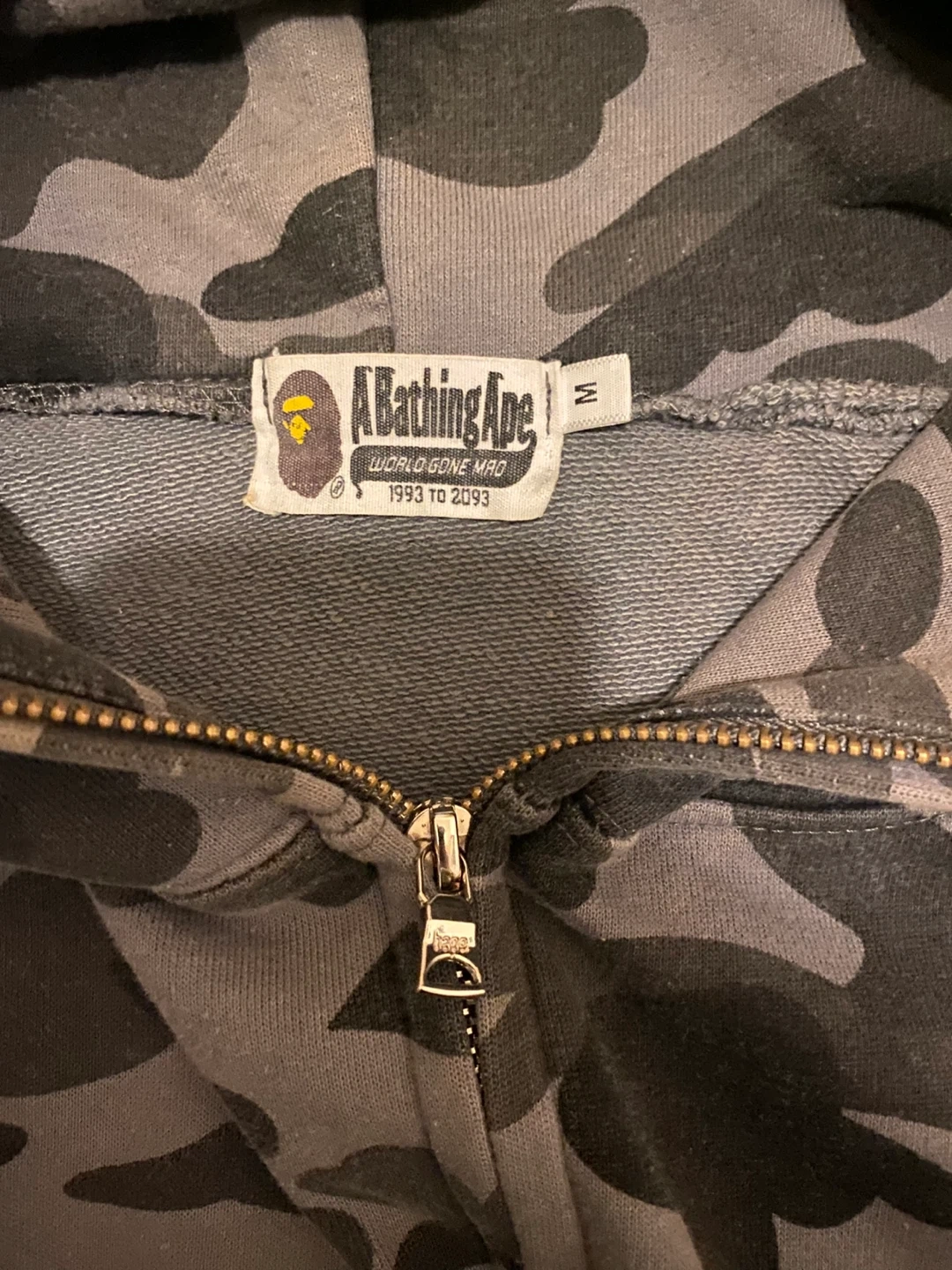 This A Bathing Ape hoodie features the signature camouflage pattern and shark graphic. It's a full-zip style with a size M tag. Made of a comfortable cotton blend.