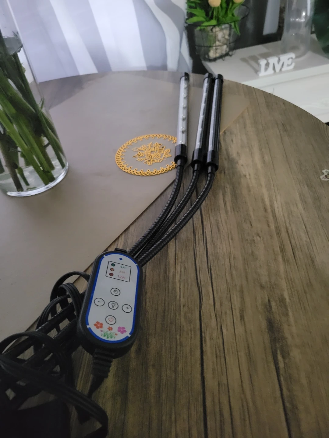 This LED plant grow light features three flexible gooseneck arms, each with a light head. It has a convenient control panel with timer settings for 4, 8, or 12 hours, and adjustable brightness levels. The lights provide full spectrum illumination for plants. This light is suitable for seedlings, succulents, and other houseplants needing supplemental light.