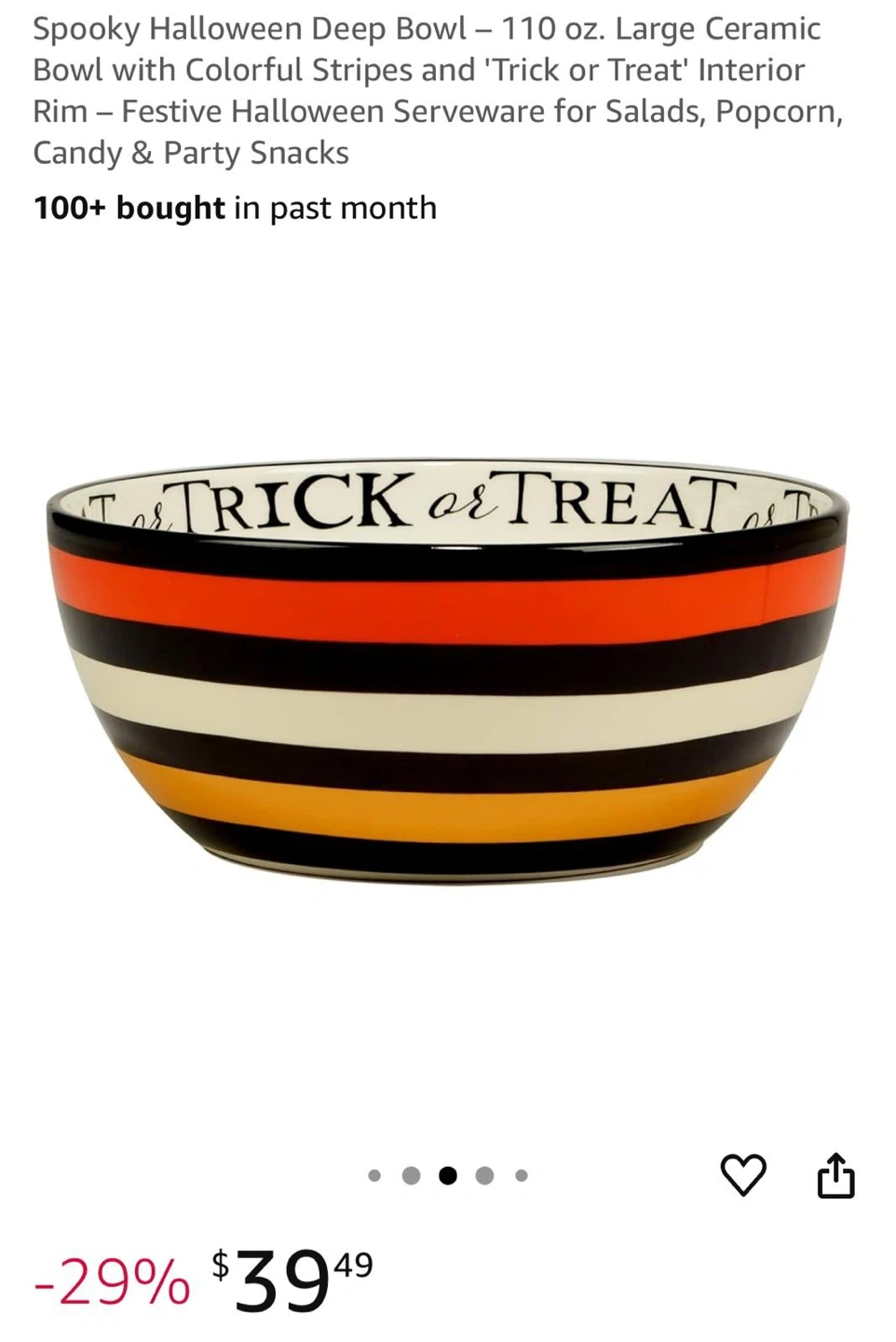 60Selling a festive Halloween serveware bowl by Mud Pie! It's perfect for salads, popcorn, candy, and party snacks. The bowl features a spooky Halloween design with colorful stripes and a 'Trick or Treat' interior rim. Originally bought for $42