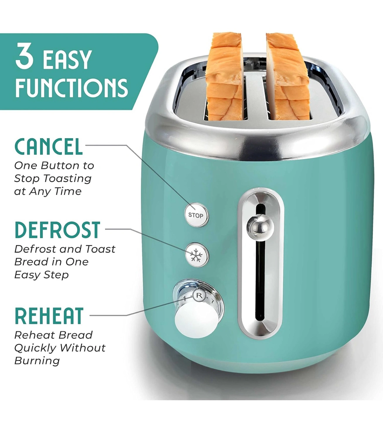 Selling a Mueller Home Retro 2-Slice Toaster in turquoise! This toaster has 7 browning levels and 3 functions: reheat, defrost, and cancel. It also features a removable crumb tray and under-base cord storage. Compact and reliable, it makes toasting your favorite breads easy! Dimensions are 6.9" x 11.5" x 6.5".