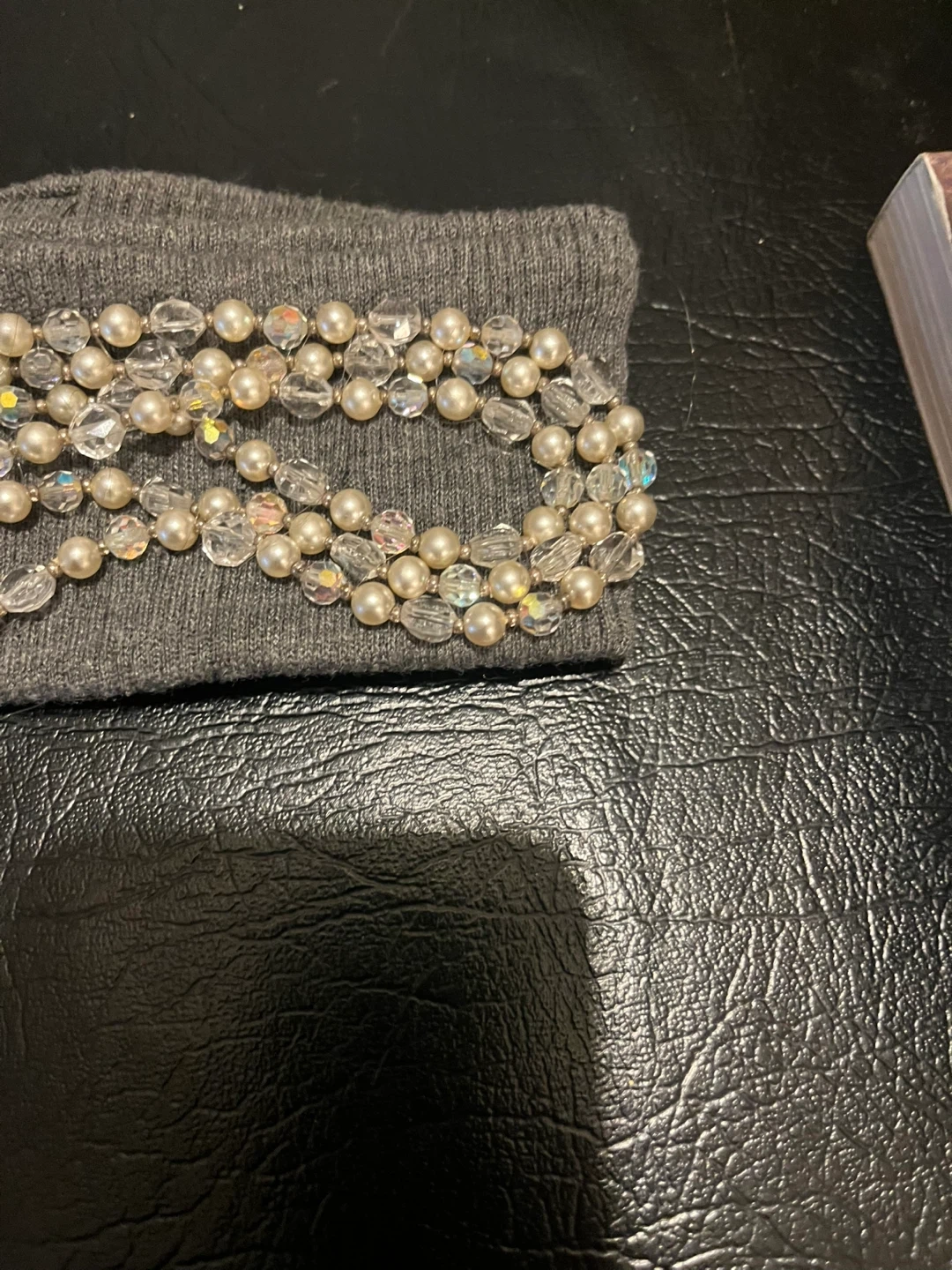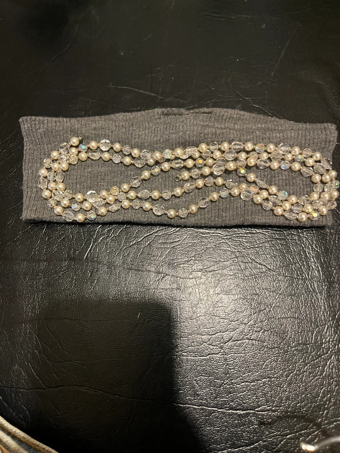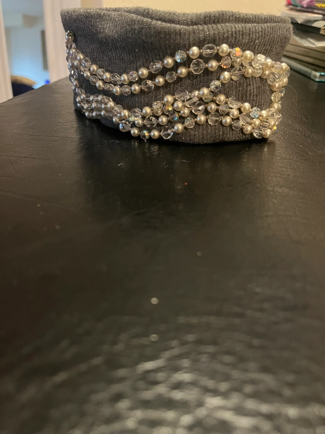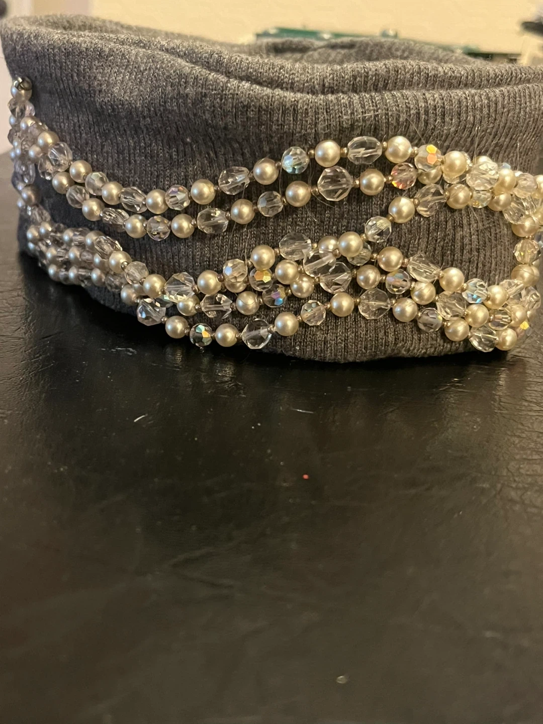 A grey knit beanie adorned with multiple strands of faux pearls and clear crystal beads. It's a stylish accessory for cooler weather. Fabric is soft knit. Beads are securely attached.