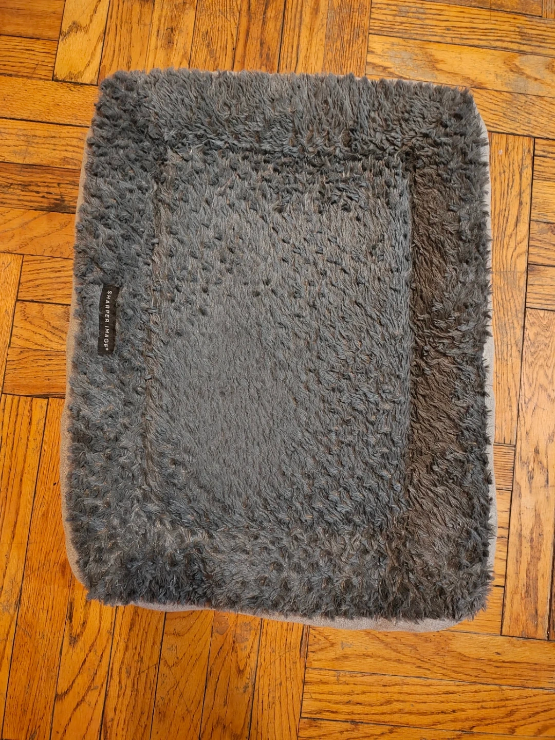 This is a gray, plush pet mat from Sharper Image. It's made of soft, shaggy material for comfort. It's a great size for crates or travel. Tip are welcomed