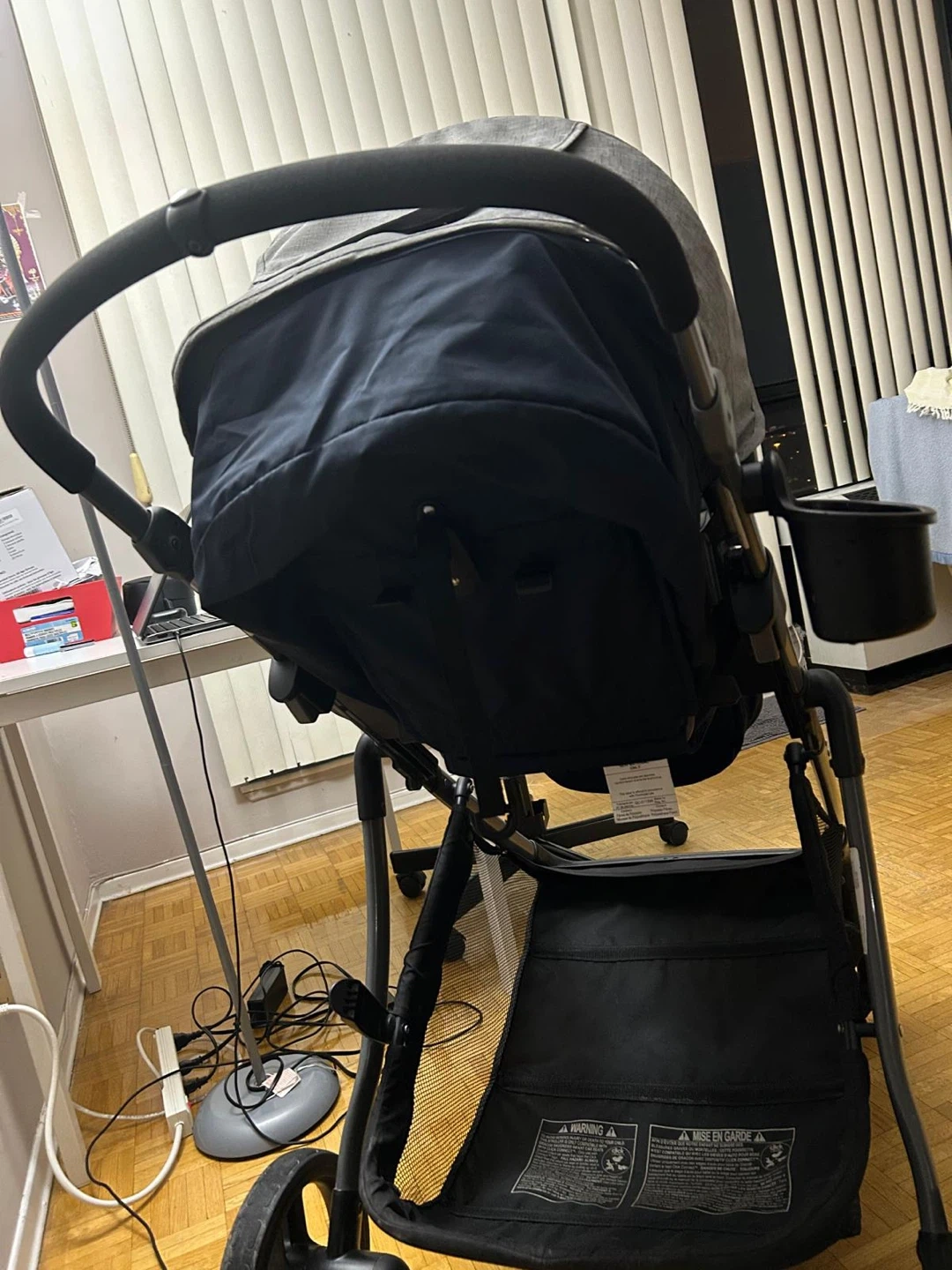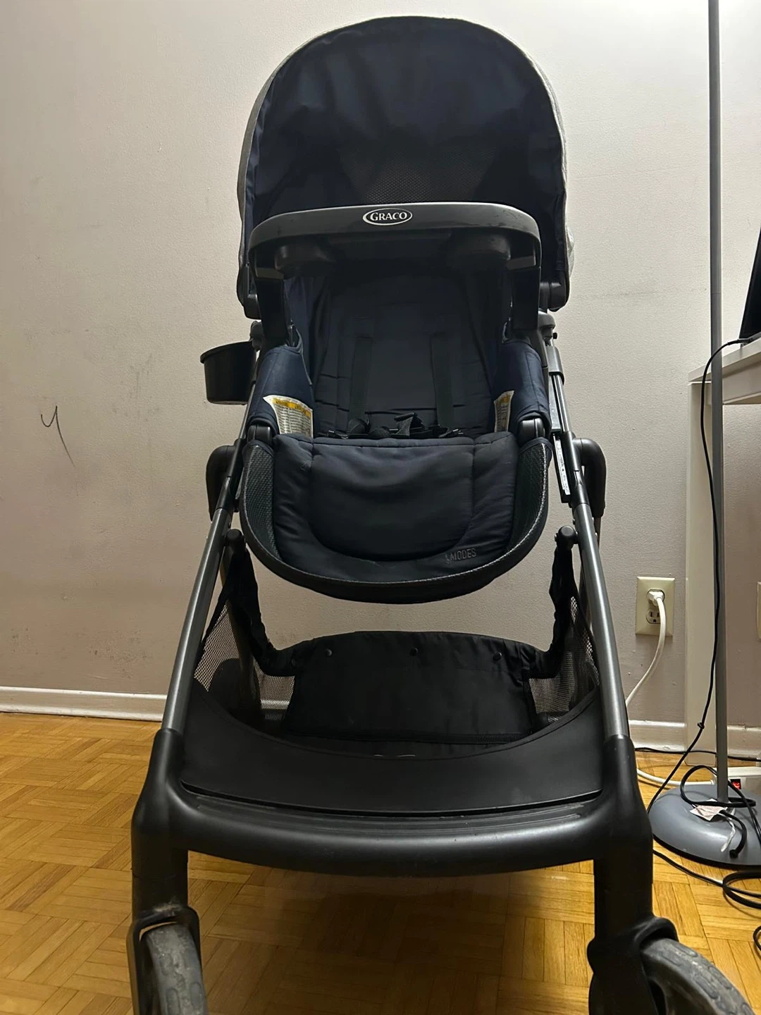 This is a Graco stroller in a dark navy blue colour. It has a large storage basket underneath. The seat reclines for your little one's comfort. It's perfect for daily walks!
