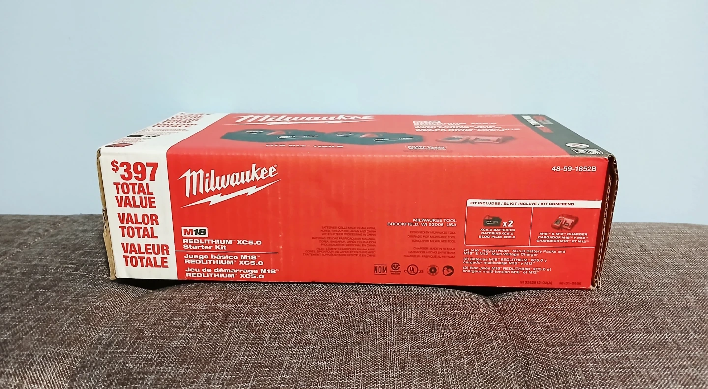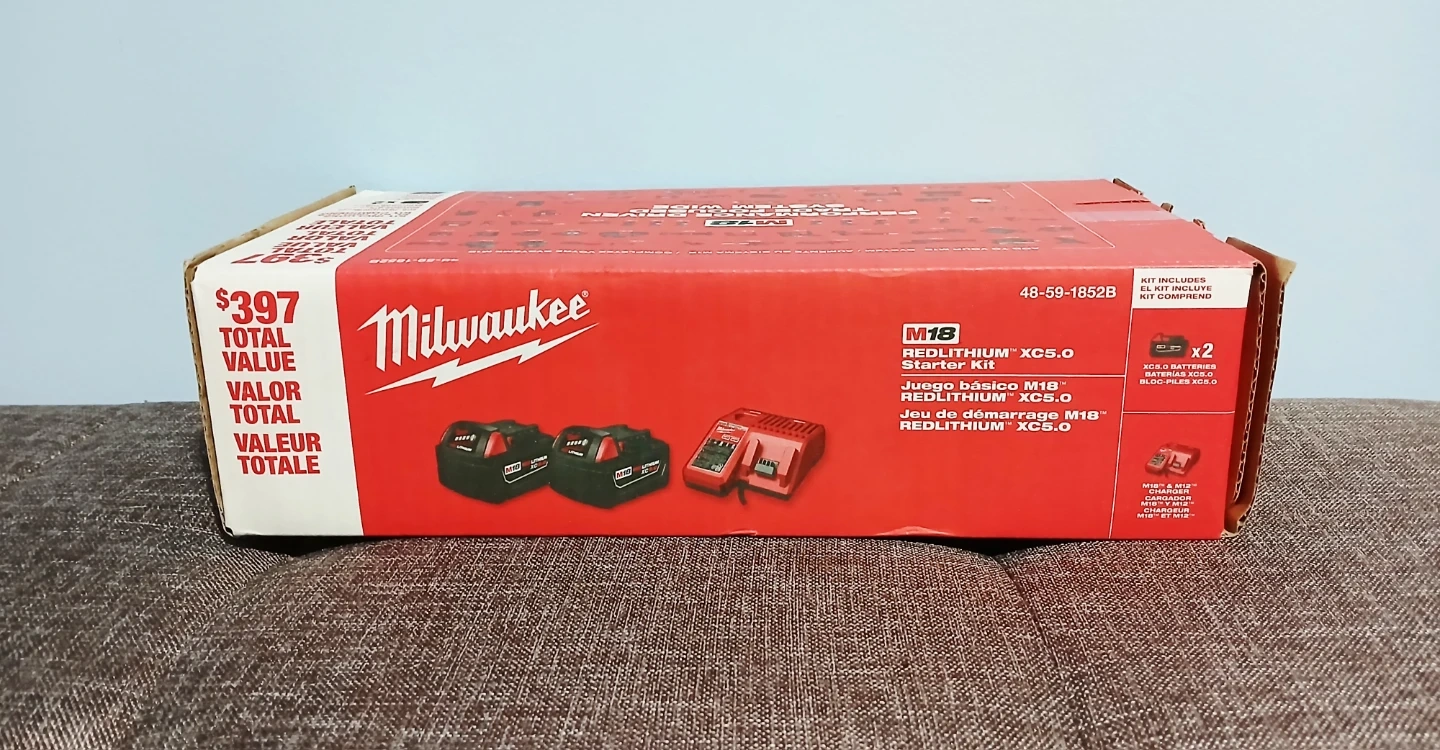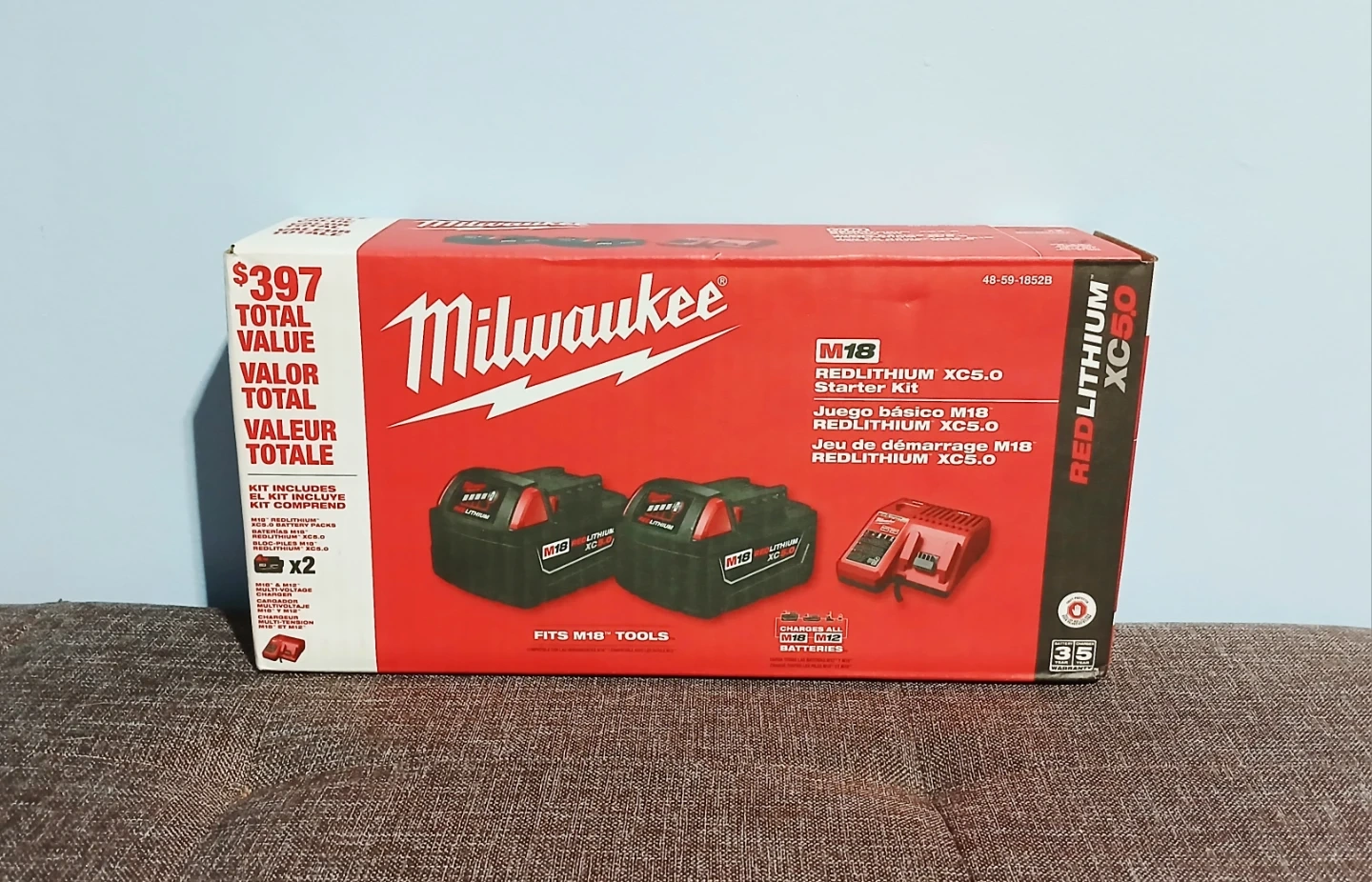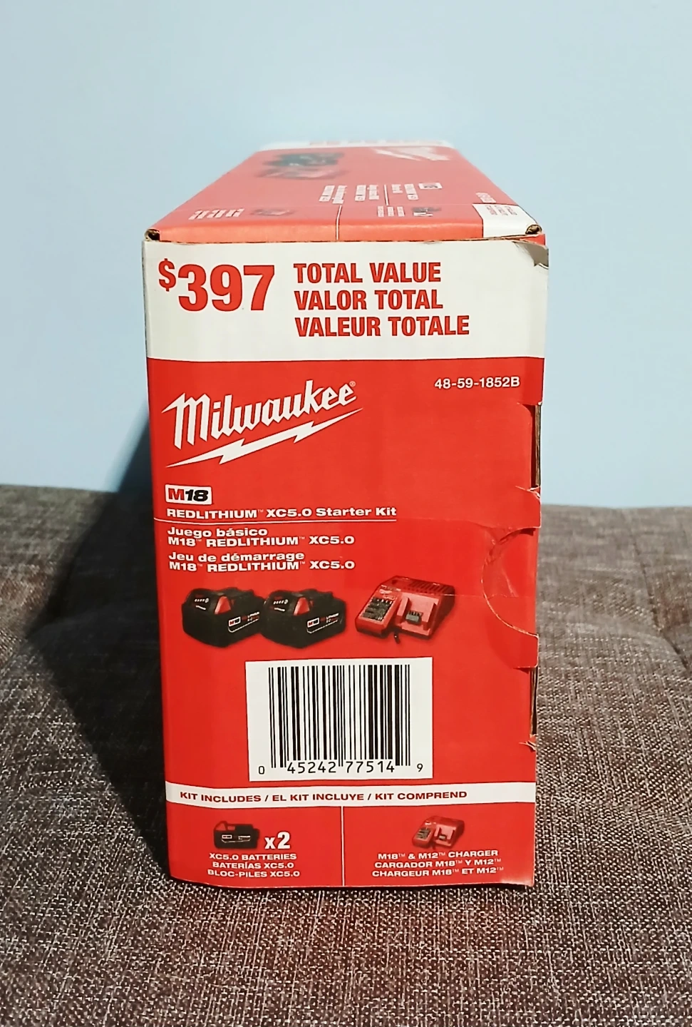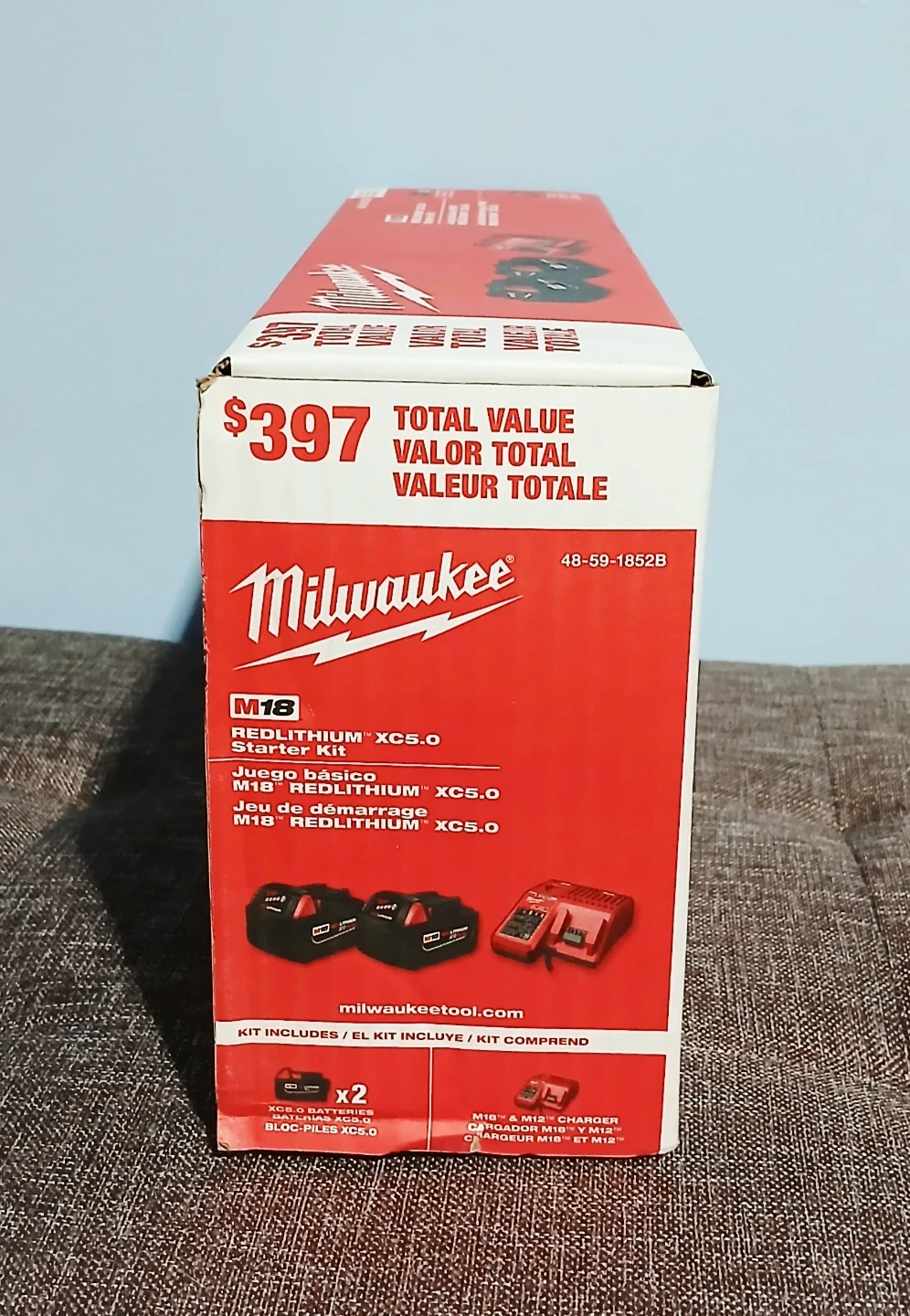 Milwaukee M18 REDLITHIUM XC5.0 Starter Kit! The box includes 2 XC5.0 batteries and an M18 & M12 charger. The total value is $397