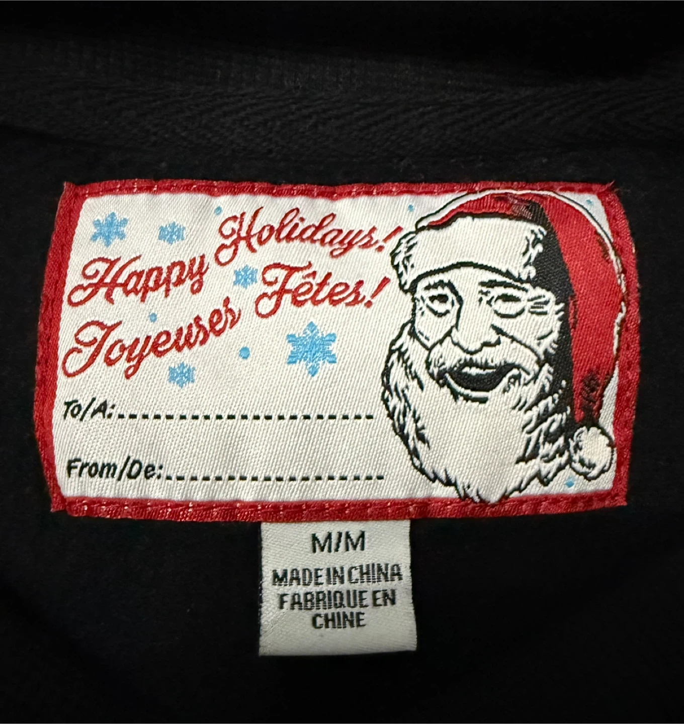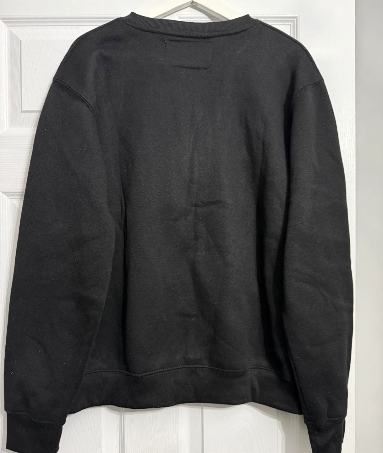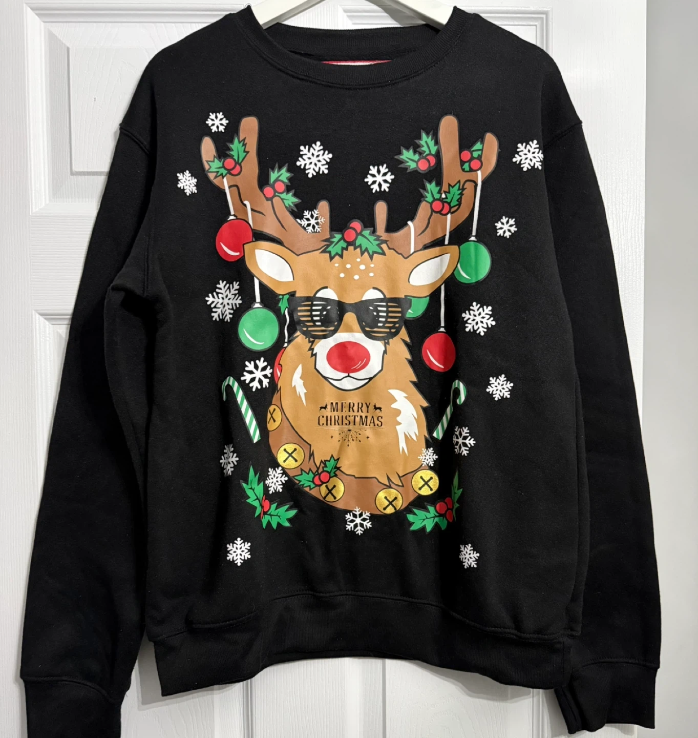 Black crewneck sweater with a festive Rudolph graphic. It's made with 95% cotton and 5% spandex. This sweater is perfect for holiday parties!