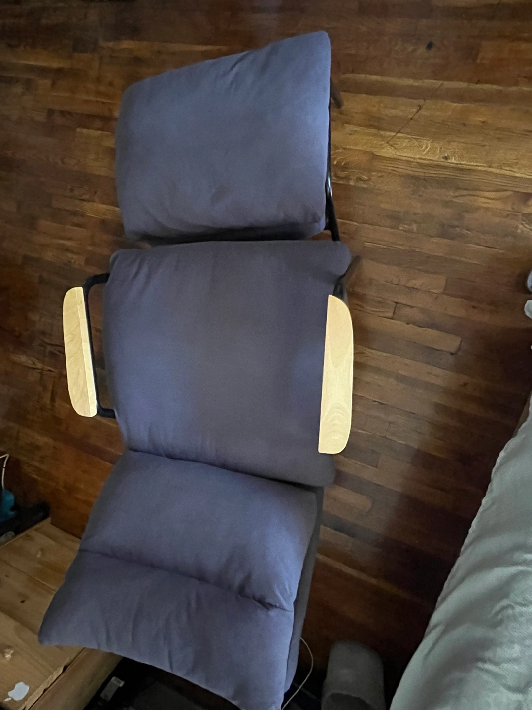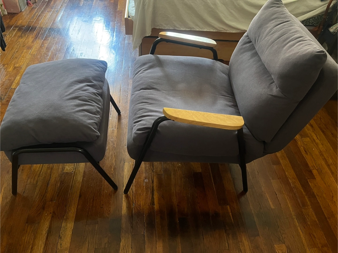 Comfortable armchair and ottoman. Gray fabric upholstery. Wooden armrests. Black metal legs. Minimalist design. Perfect for small spaces.