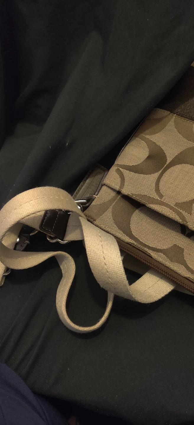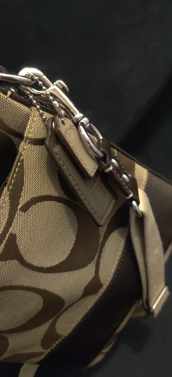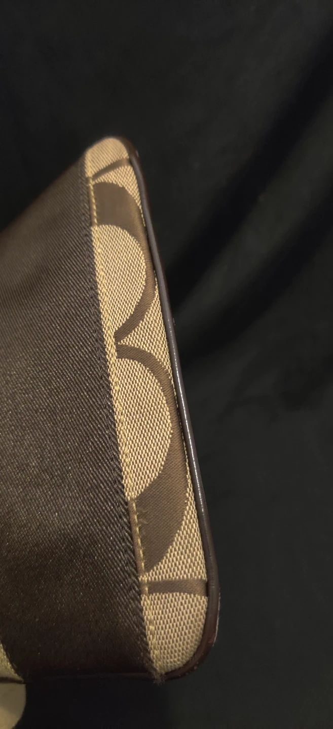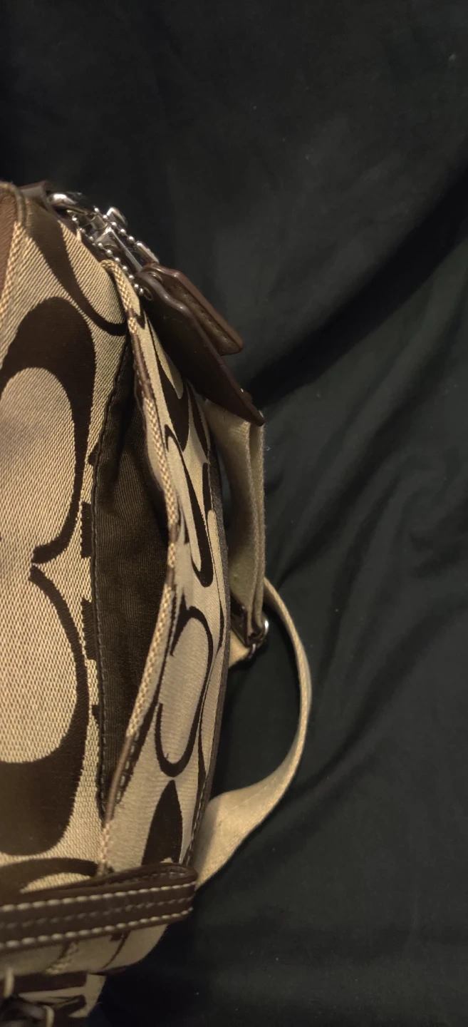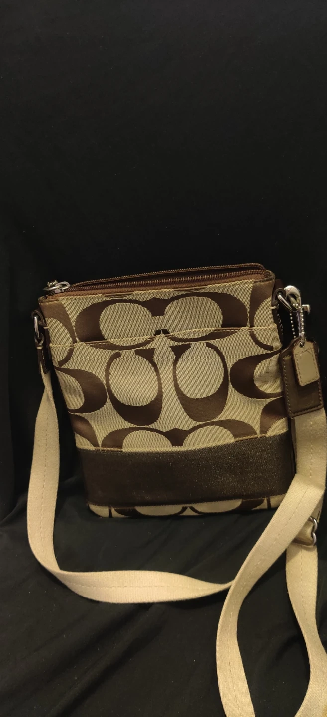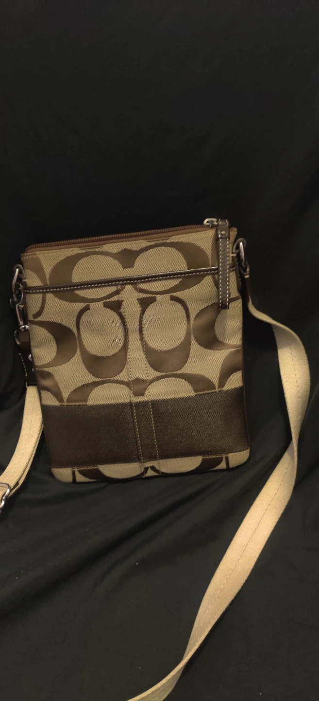 This is a Coach crossbody bag featuring the classic monogram pattern. Bag has 2 outside pockets The interior is lined and includes a zippered main compartment.Bag is preowned so minor sign of wear should be expected. The coach logo isnt printed in the inside. Yes the bag is real.