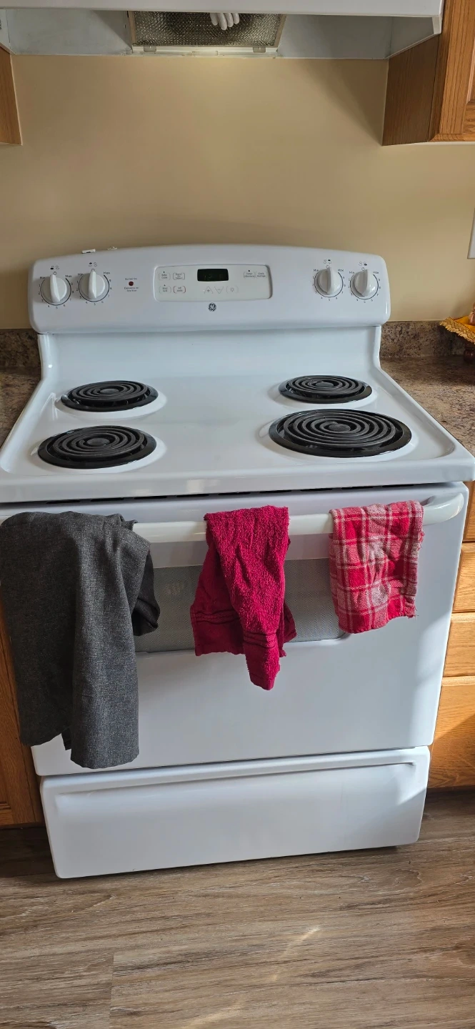 This is a white GE electric stove with a coil cooktop. It features four burners and an oven below. It's a standard size for most kitchens. This stove is ready to be installed in your home!