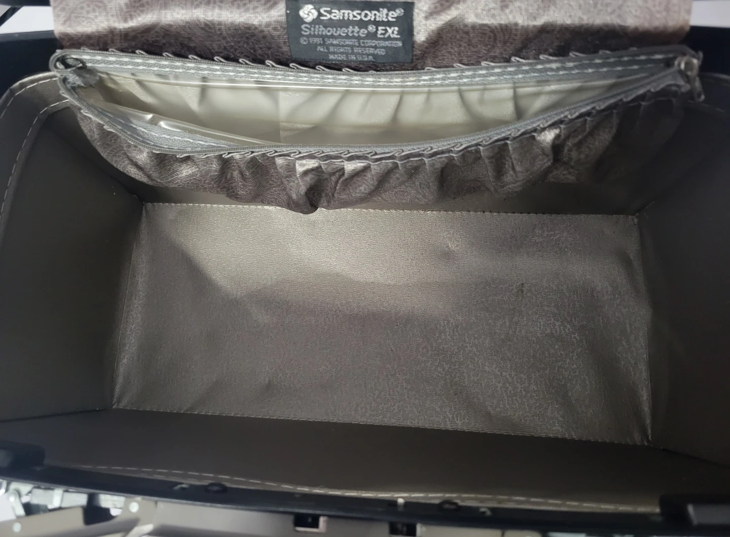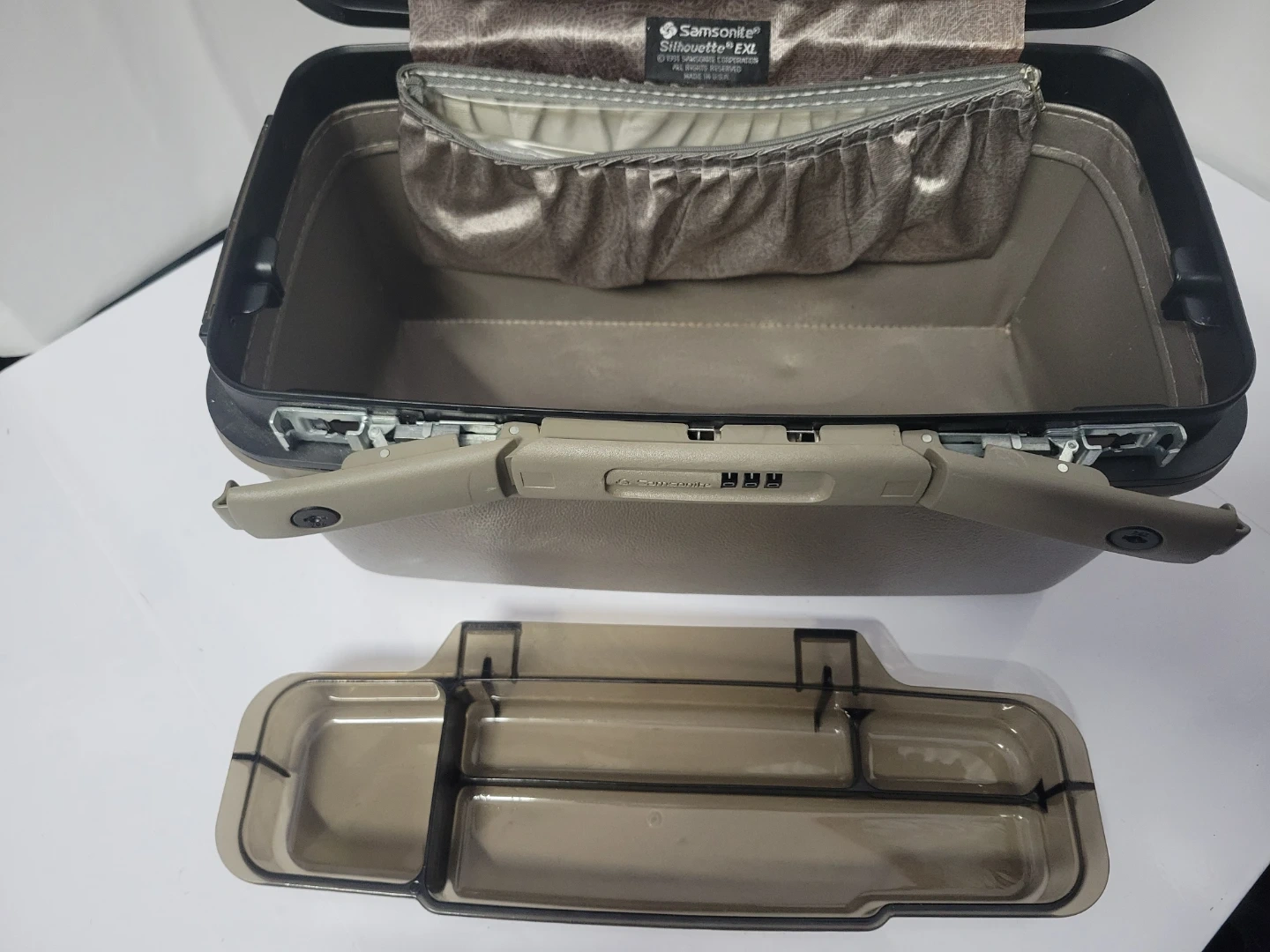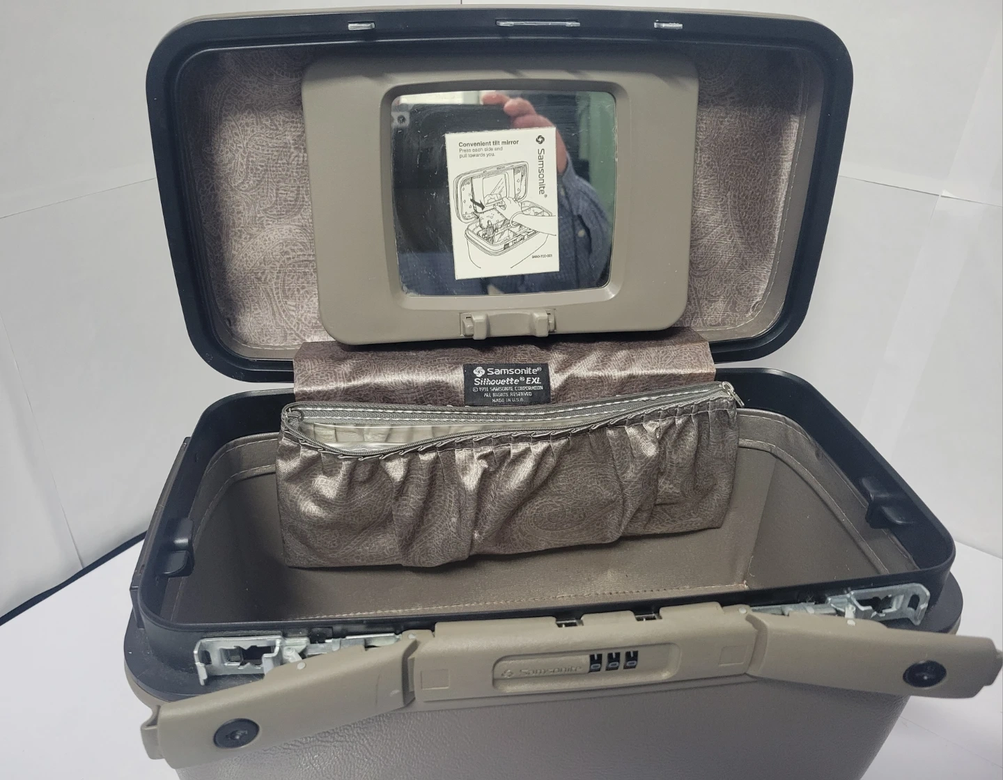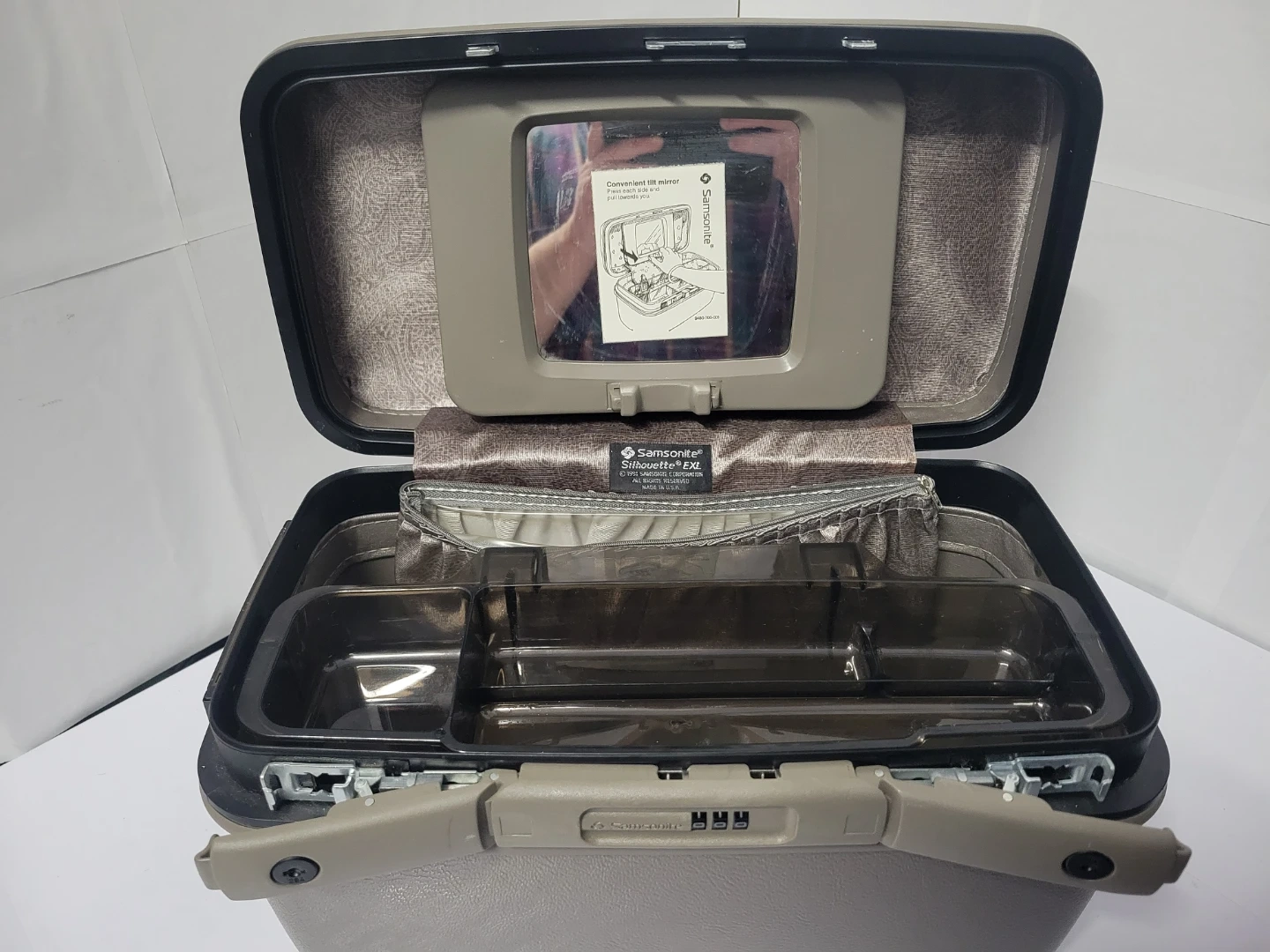 This Samsonite Silhouette EXL vanity case is a great travel companion. It features a convenient tilt mirror inside. The interior has a zippered pouch and an open compartment for storage. Clean inside, no smell or stains. Condition like new.