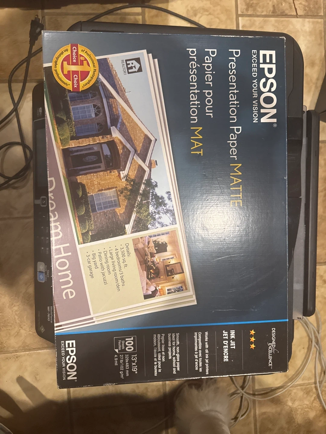 This is an Epson WorkForce WF-7610 all-in-one printer. It's a wireless inkjet printer that can print, scan, and copy. It comes with a box of Epson Presentation Paper Matte paper, 100 sheets, 13" x 10". This printer is suitable for home offices needing to print professional-looking documents.