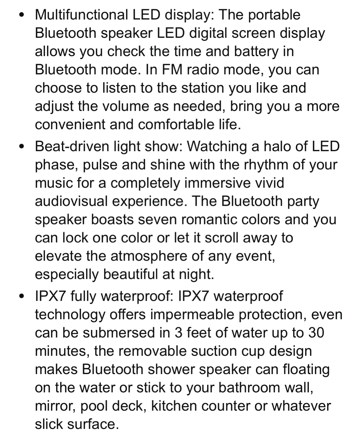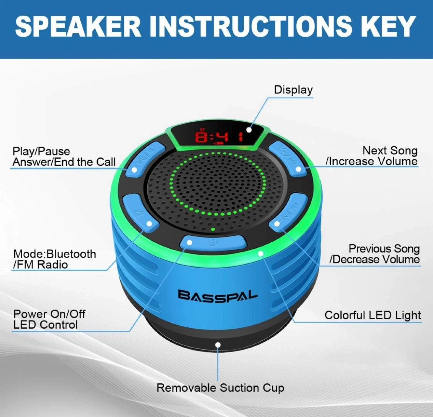 This is a BASSPAL waterproof wireless speaker with a multifunctional LED display. It features IPX7 waterproofing and a beat-driven light show. The removable suction cup makes it great for use in the shower or by the pool!