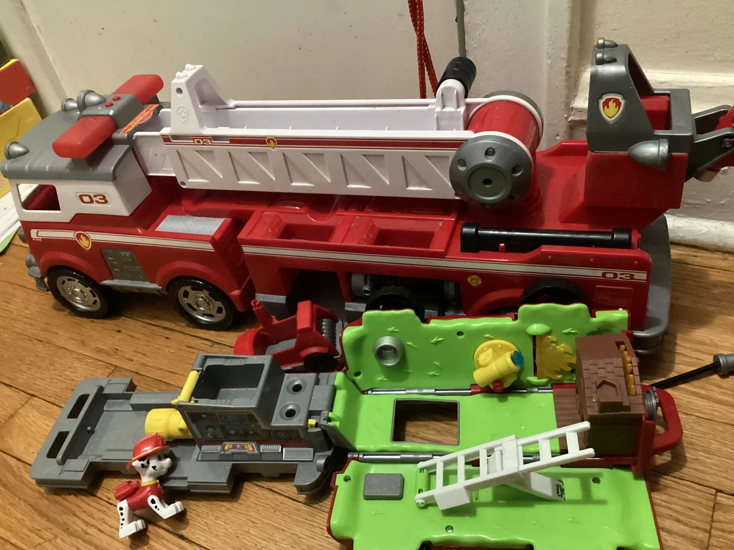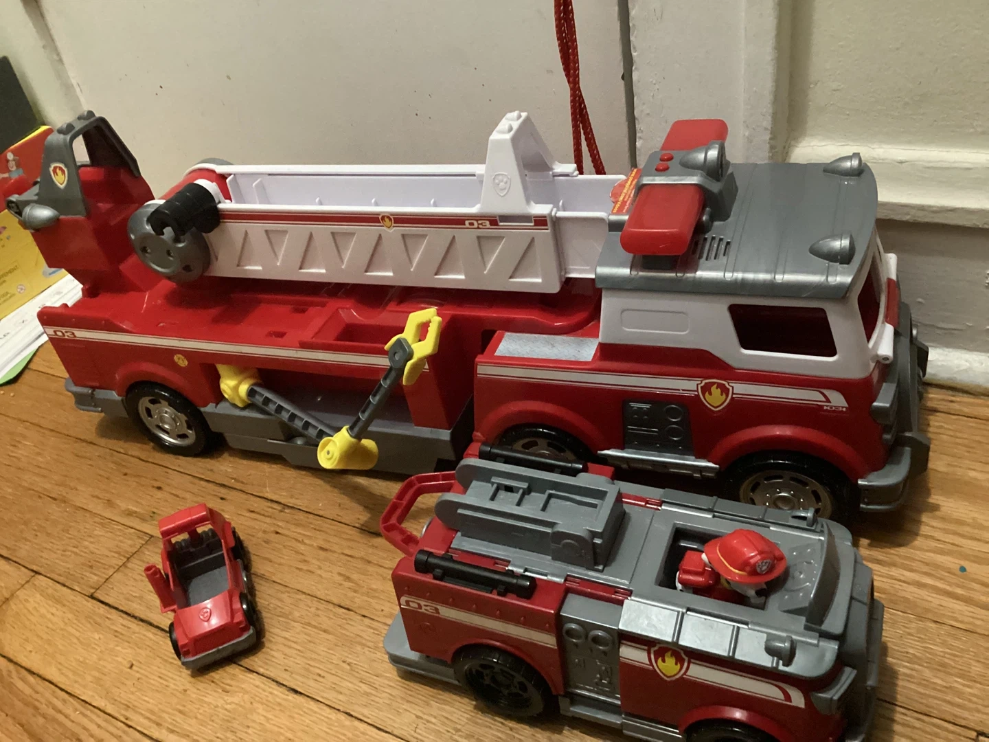 This Paw Patrol toy features Marshall's fire truck with accessories. It includes a smaller vehicle and rescue equipment as well as Marshall. Perfect for imaginative play!