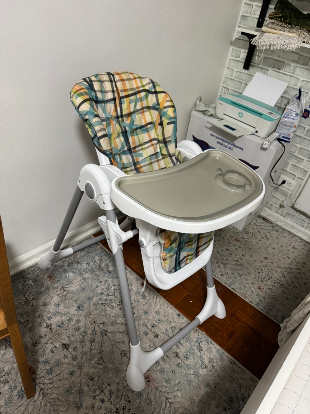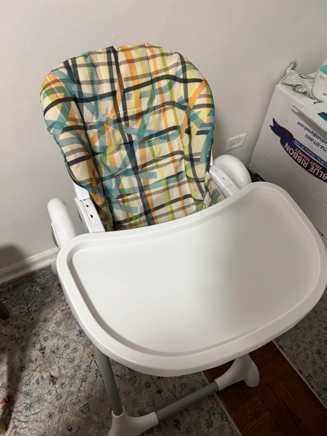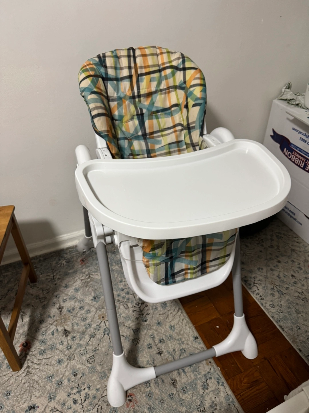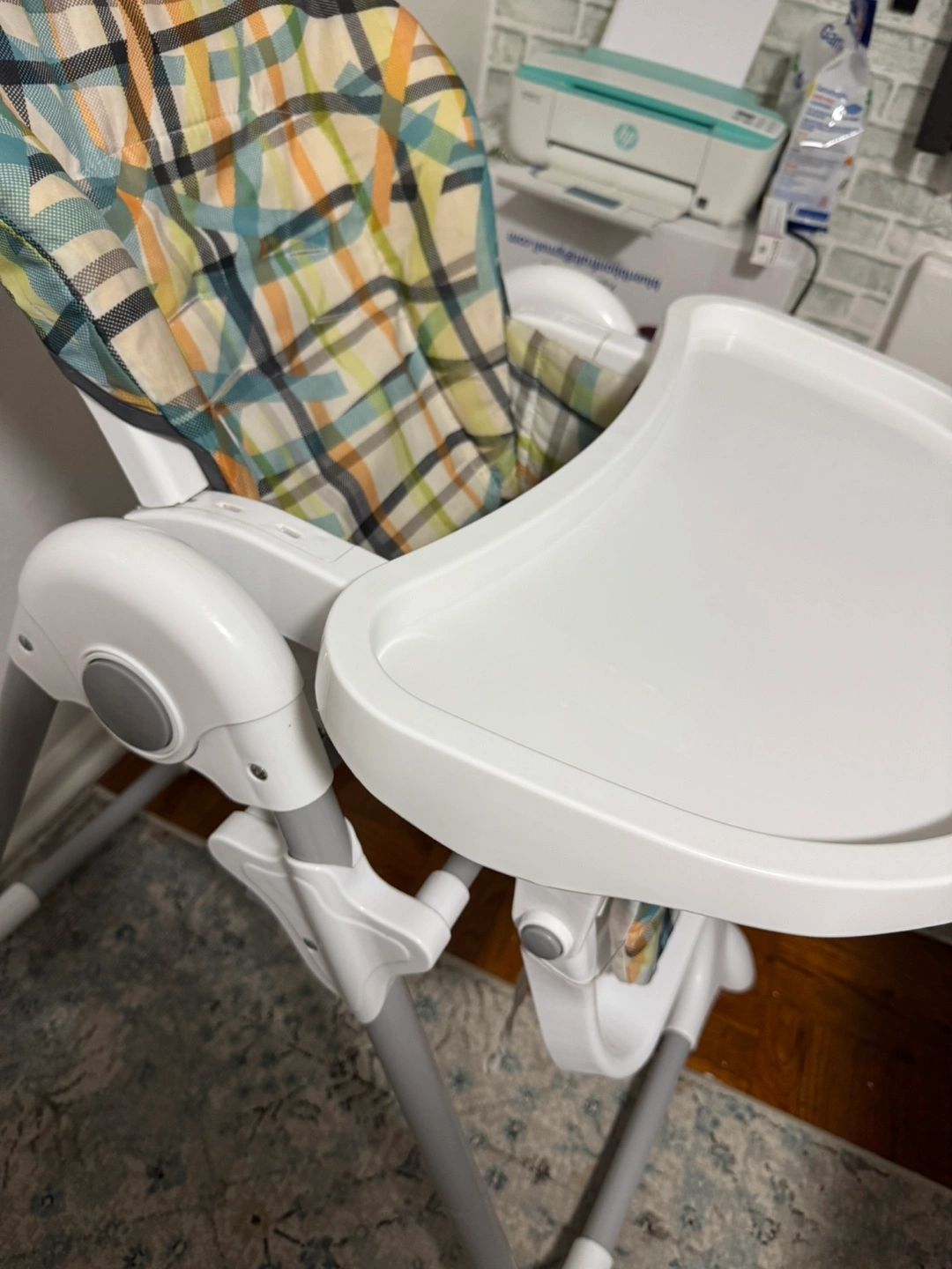 Selling a high chair in great condition! It features a white frame and a comfortable seat with a colorful plaid pattern. Perfect for meal times with your little one