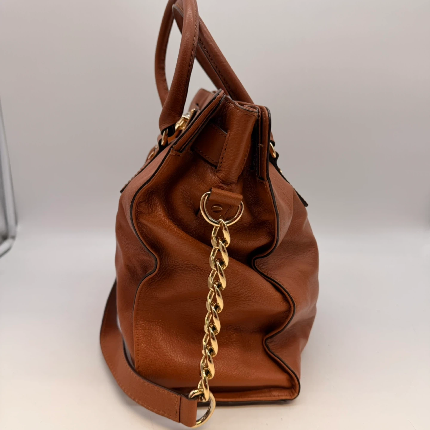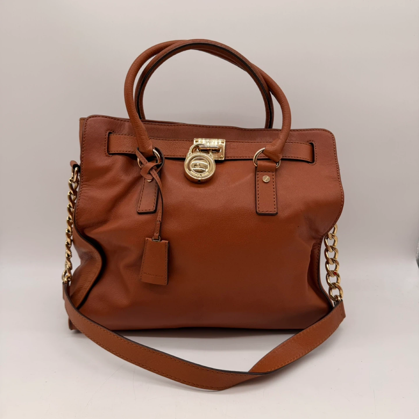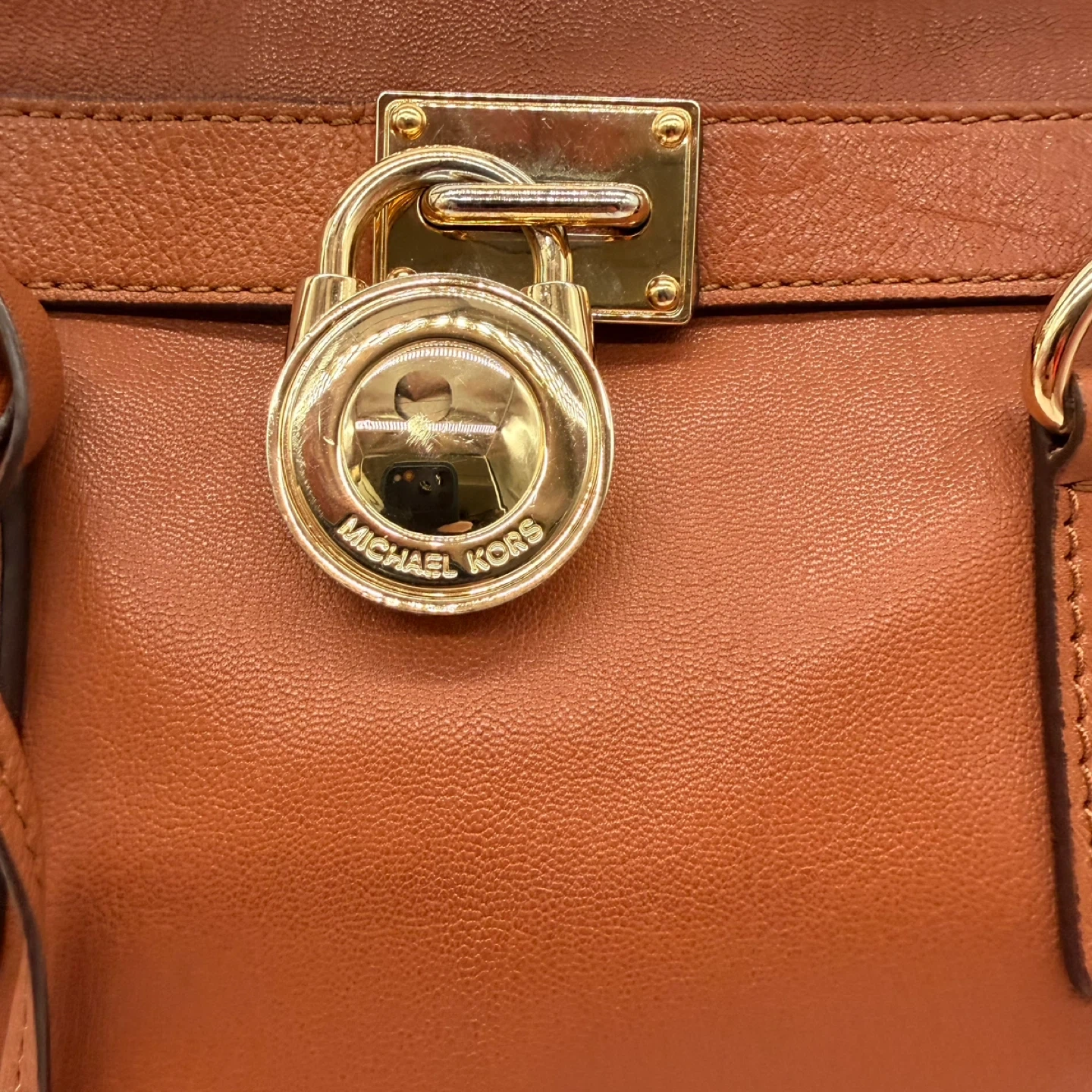 Authentic Michael Kors Hamilton satchel handbag in rich brown leather with gold hardware and signature lock detail.