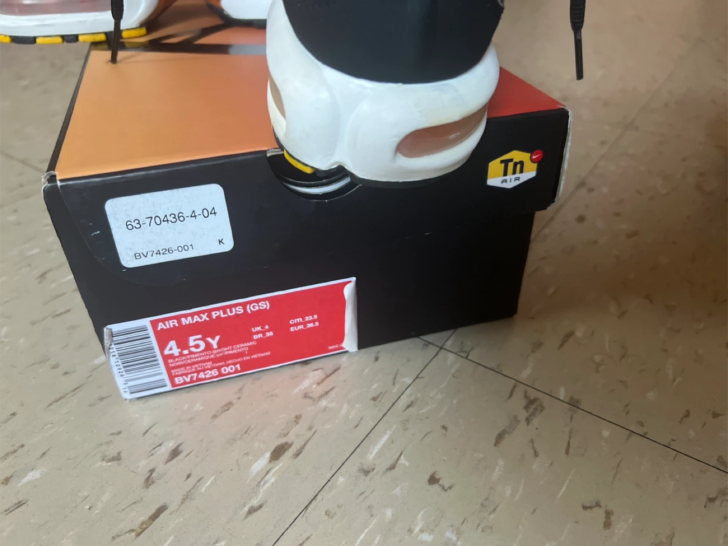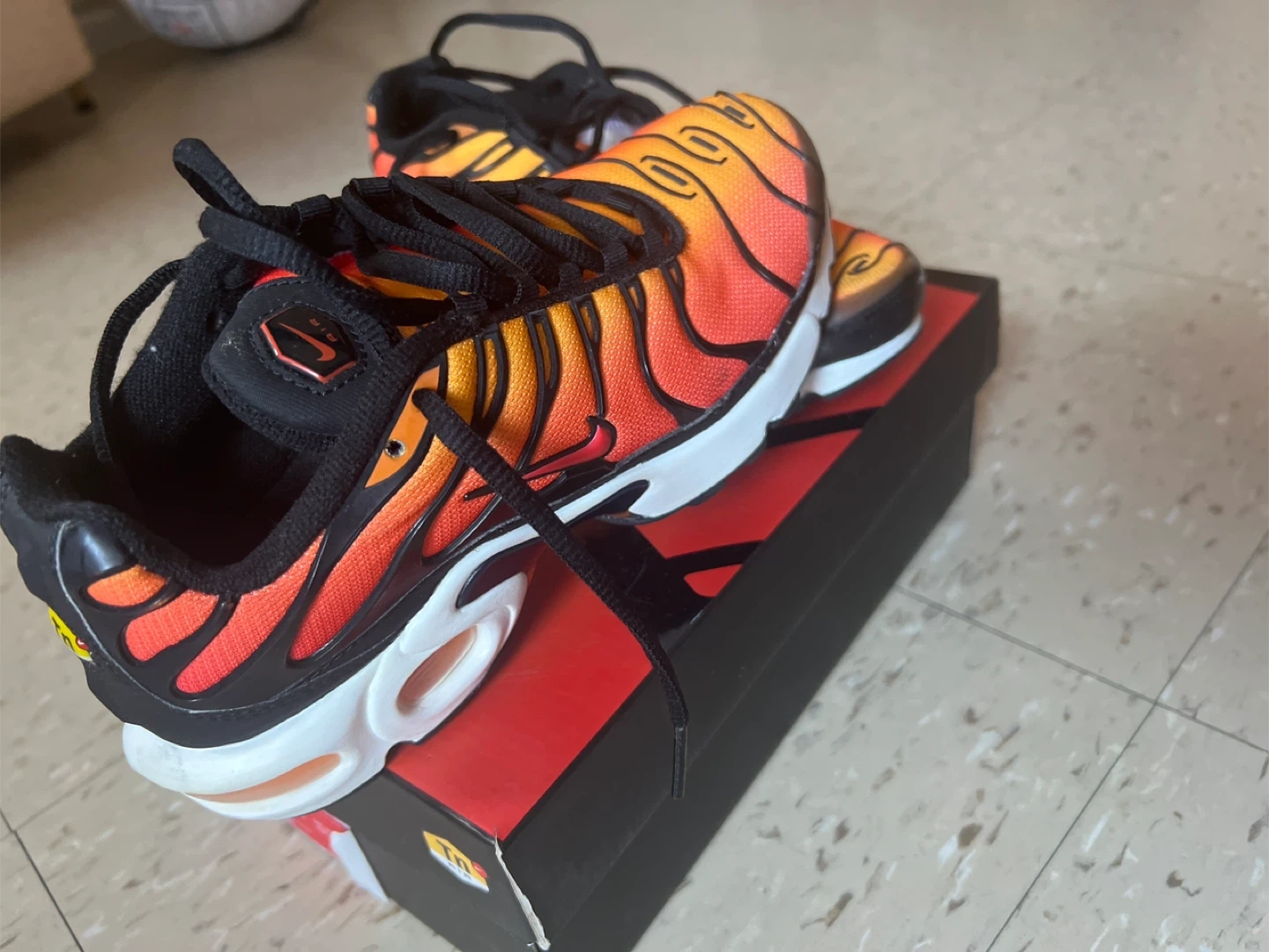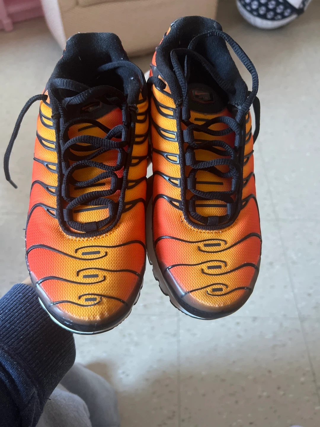 Nike Air Max Plus (GS) youth running shoes in a vibrant orange and black gradient. Features Tn Air cushioning. Includes original box. Size is 4.5Y (US Youth), 3.5 UK, 36.5 EUR. Made in Vietnam. These are great for everyday wear or athletic activities!