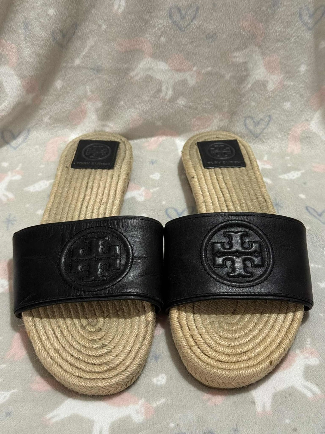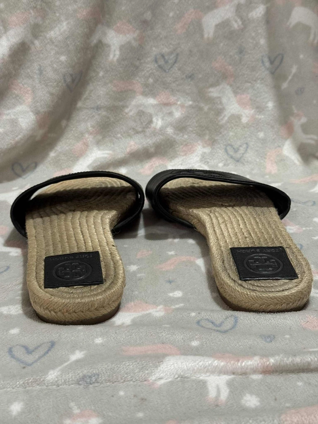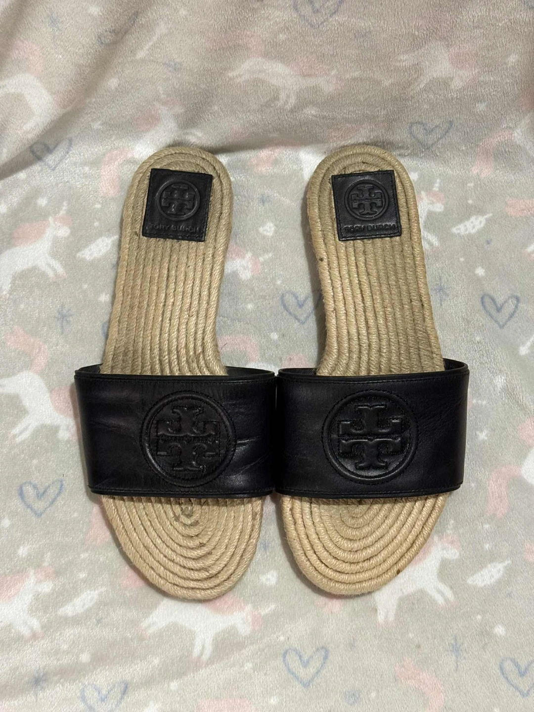 Gently used and in very good condition, these stylish Tory Burch Benton slides feature an open toe and classic espadrille sole. Comfortable and versatile, perfect for any outfits. Light signs of wear, but still plenty of life left.