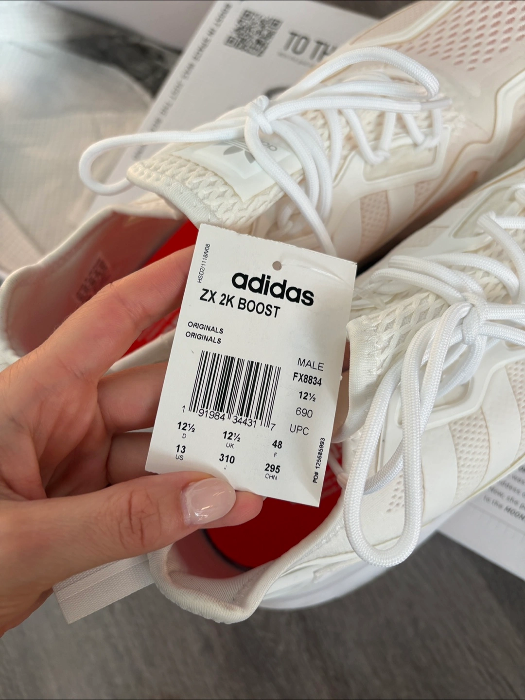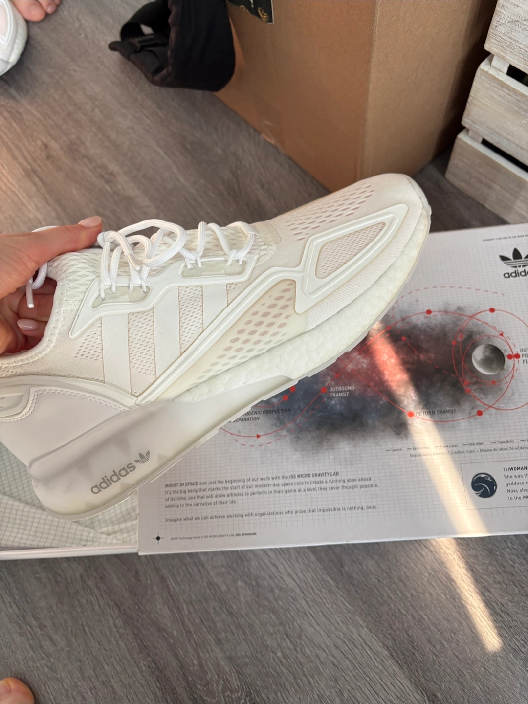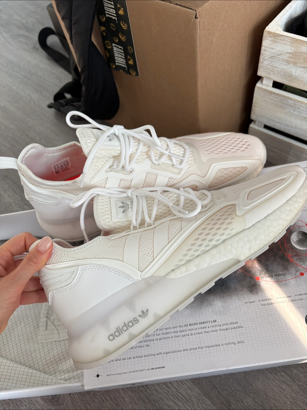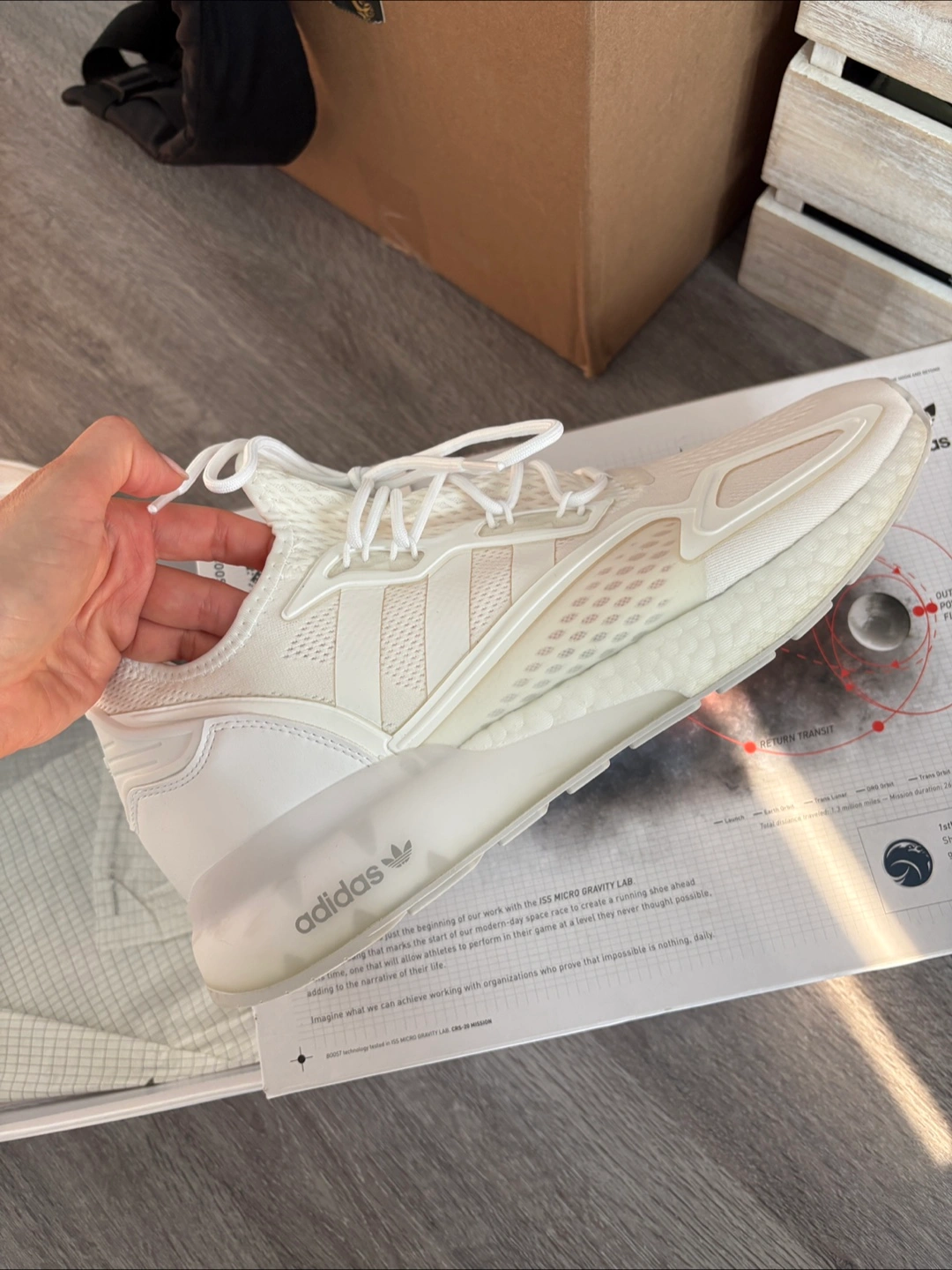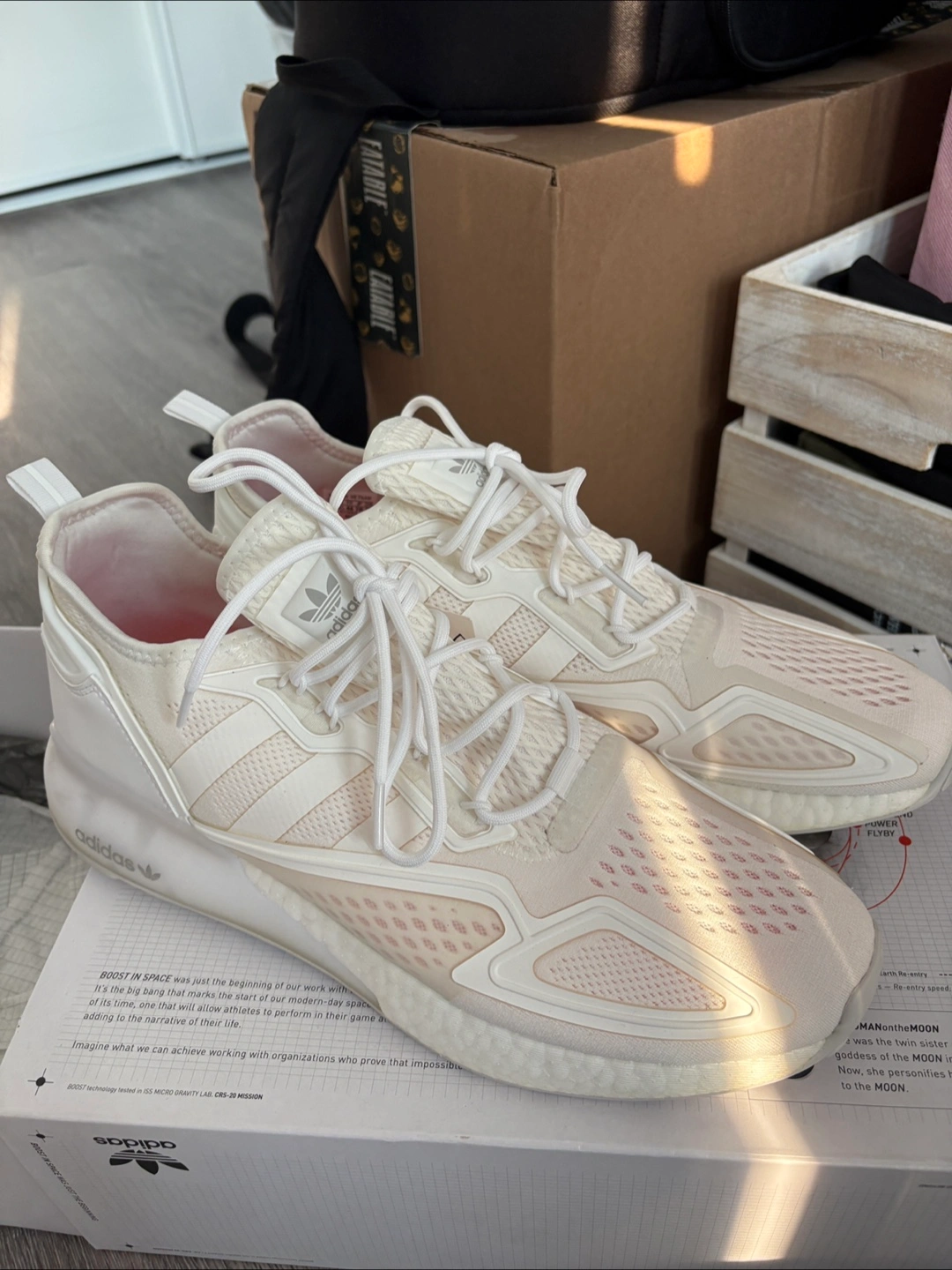 Selling a pair of Adidas ZX 2K Boost 2.0 shoes in white. These are super comfortable and stylish! They feature the iconic Adidas stripes and a Boost midsole for extra cushioning. Perfect for everyday wear or hitting the gym