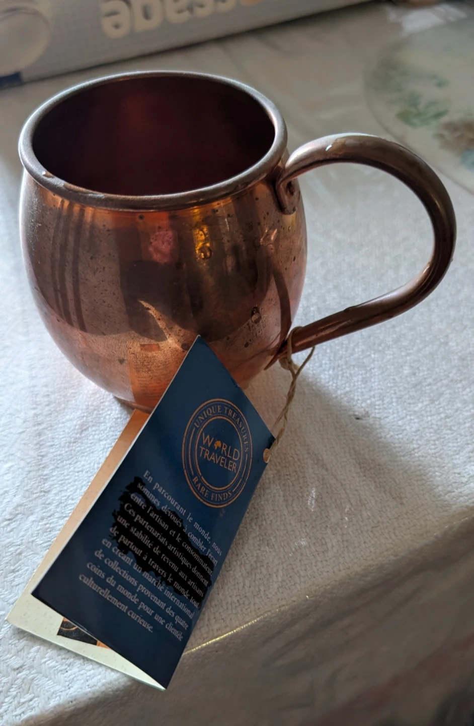 This is a copper mug from World Traveler's Rare Finds collection. It's made of copper and has a classic Moscow Mule mug design. This mug is perfect for enjoying your favorite cold beverages! Made in Turkey.