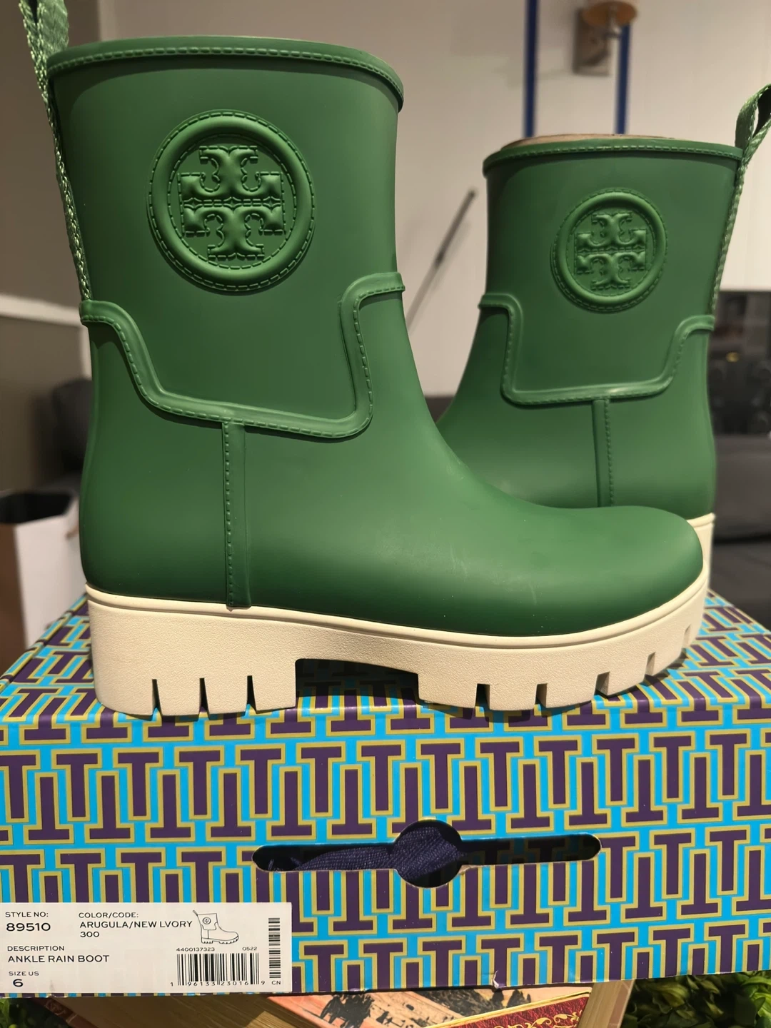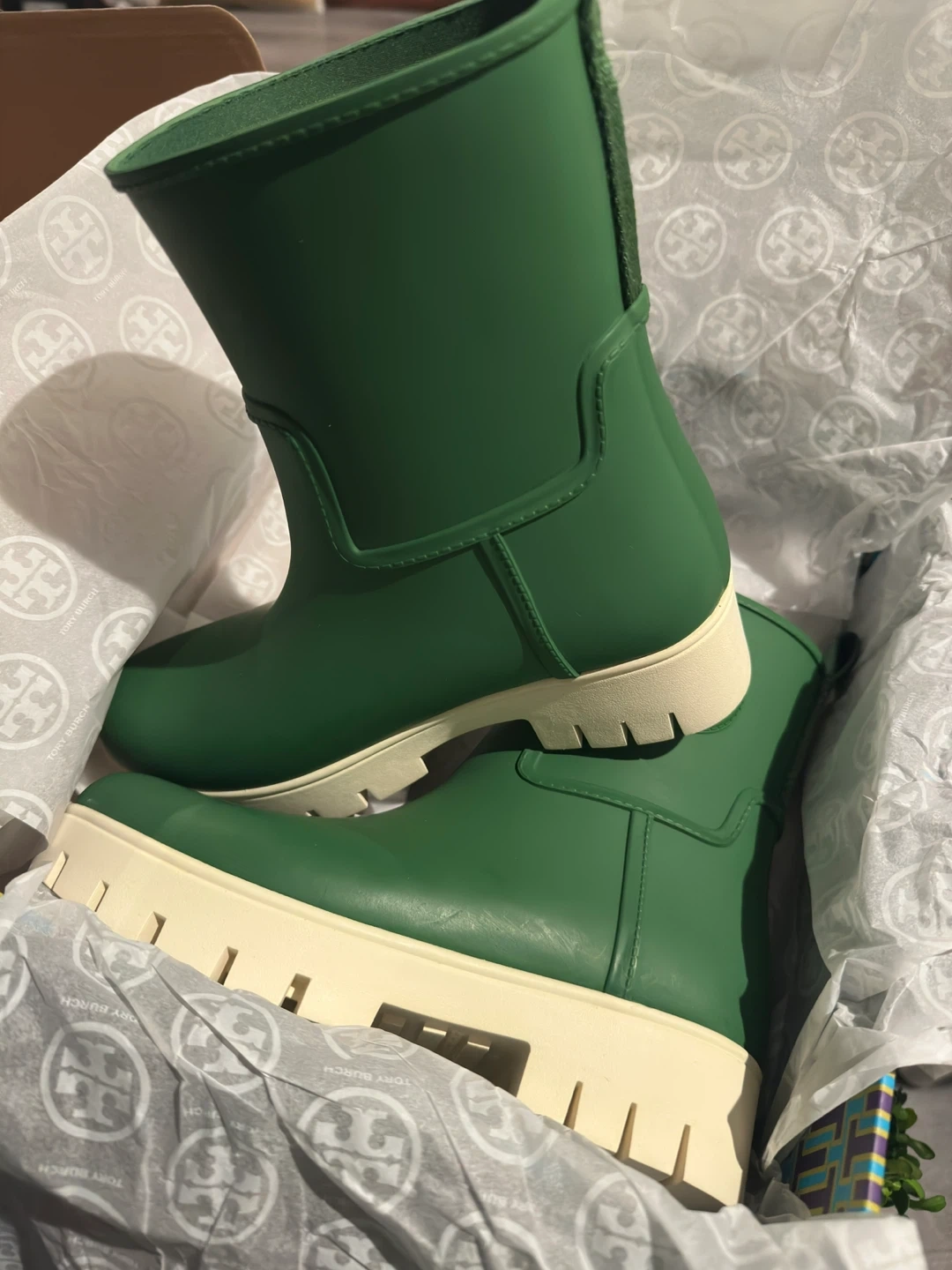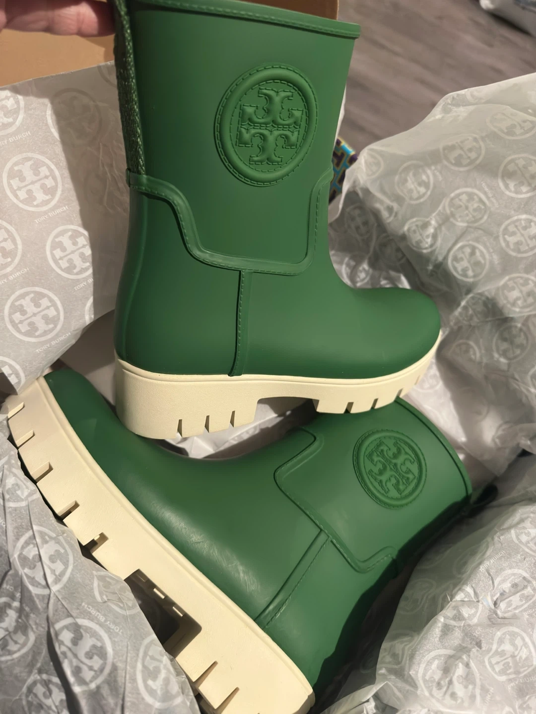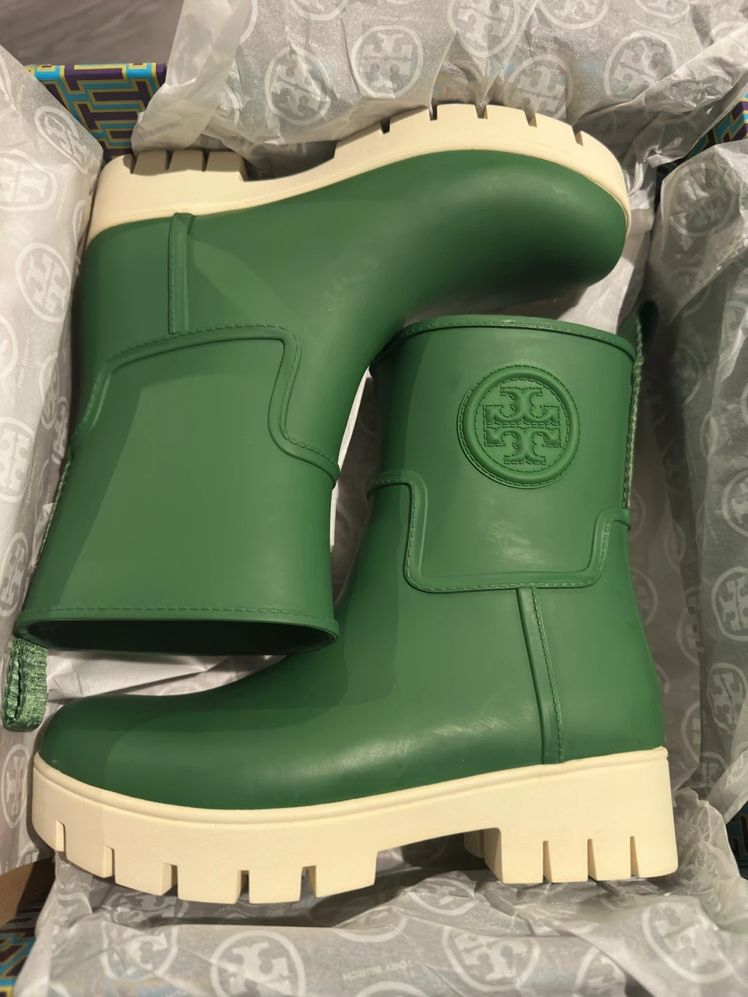 Tory Burch "Amelia" rain boots in a vibrant green colour. Rubber upper with a contrasting cream lug sole. These boots are water-resistant and perfect for wet weather.