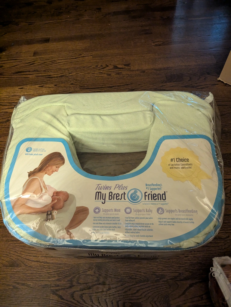 My Brest Friend Twins Plus nursing pillow, still in its original packaging! It's designed to support both mom and babies during breastfeeding. The pillow helps maintain good posture, reduces stress on the back, neck, and shoulders, and has a convenient pocket for water bottles and burp cloths. It also features a firm, flat cushion to prevent babies from rolling off, and an adjustable, silent-release buckle