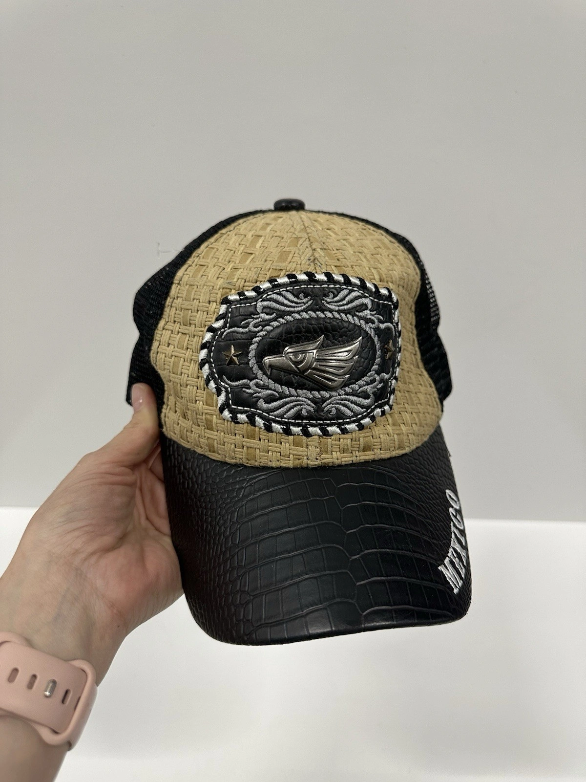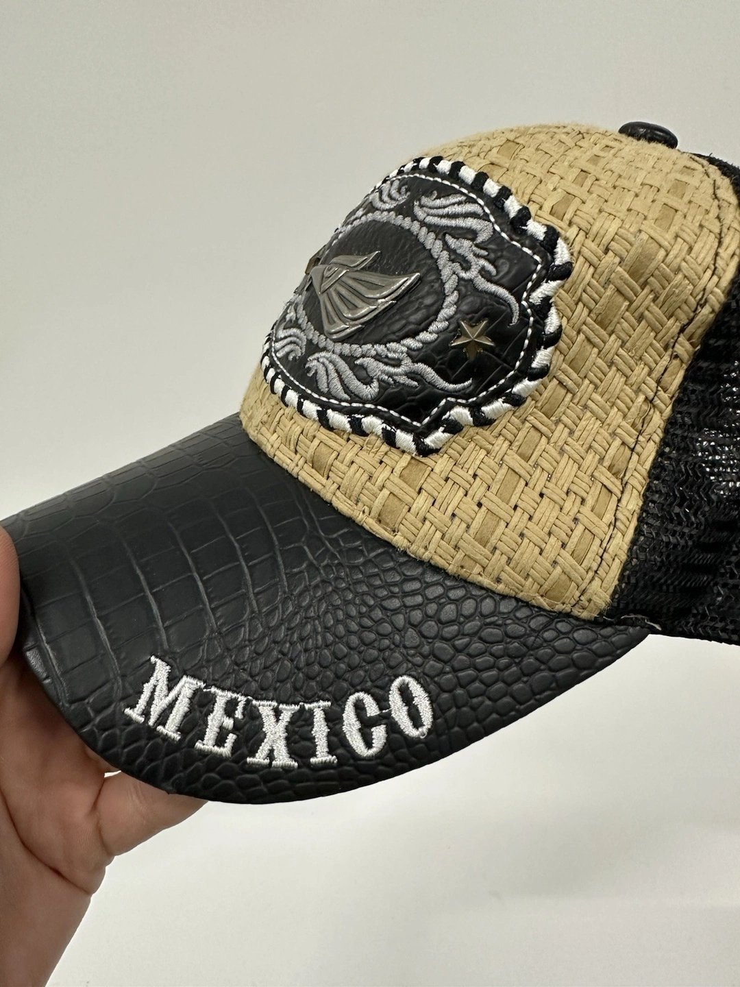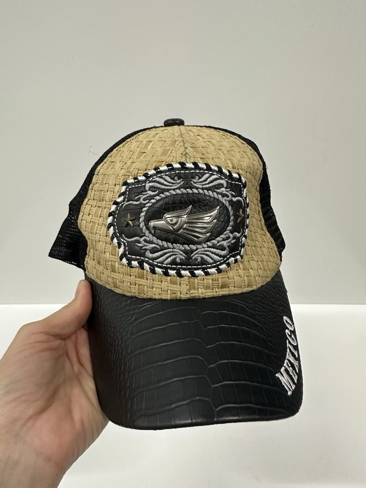 Mexico Trucker Hat Straw Leather Look Embroidered Patch Adjustab