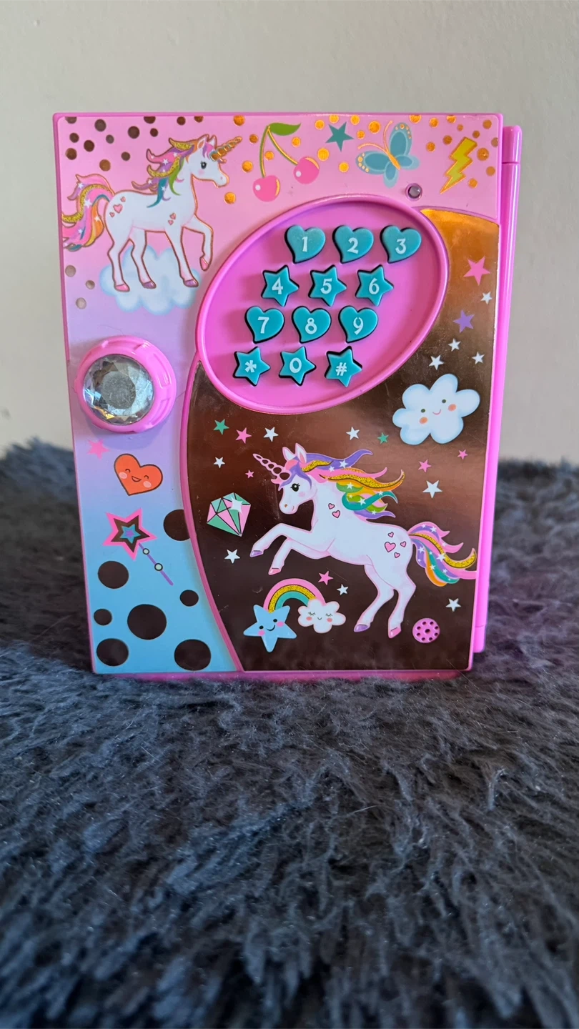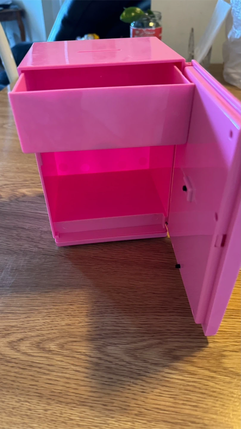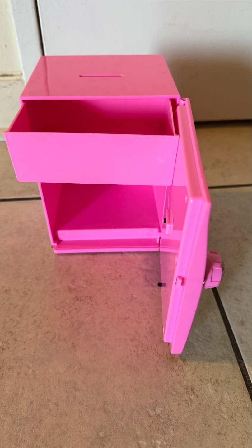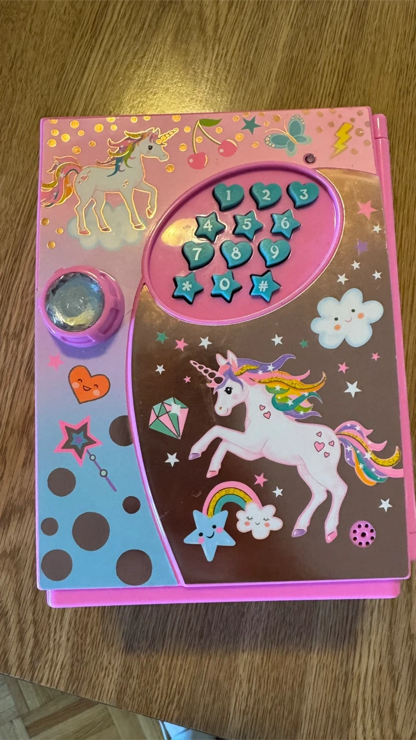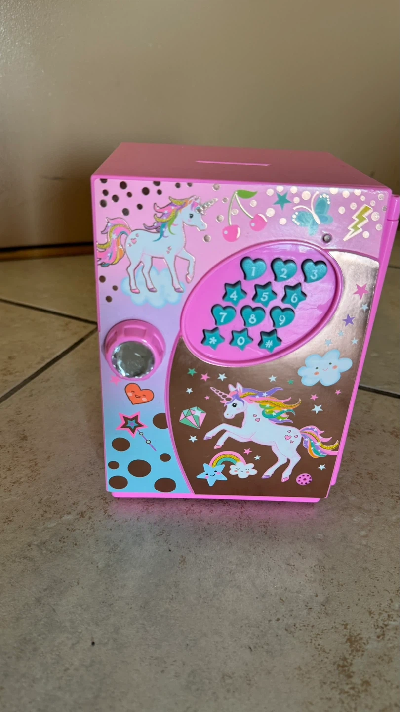 This pink lock and safe bank features a fun unicorn design with a keypad lock. It opens to a compartment and a pull-out drawer. Perfect for keeping secrets or small treasures and money safe