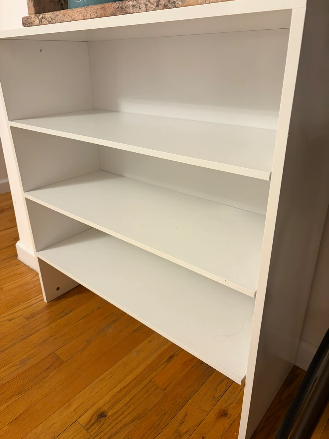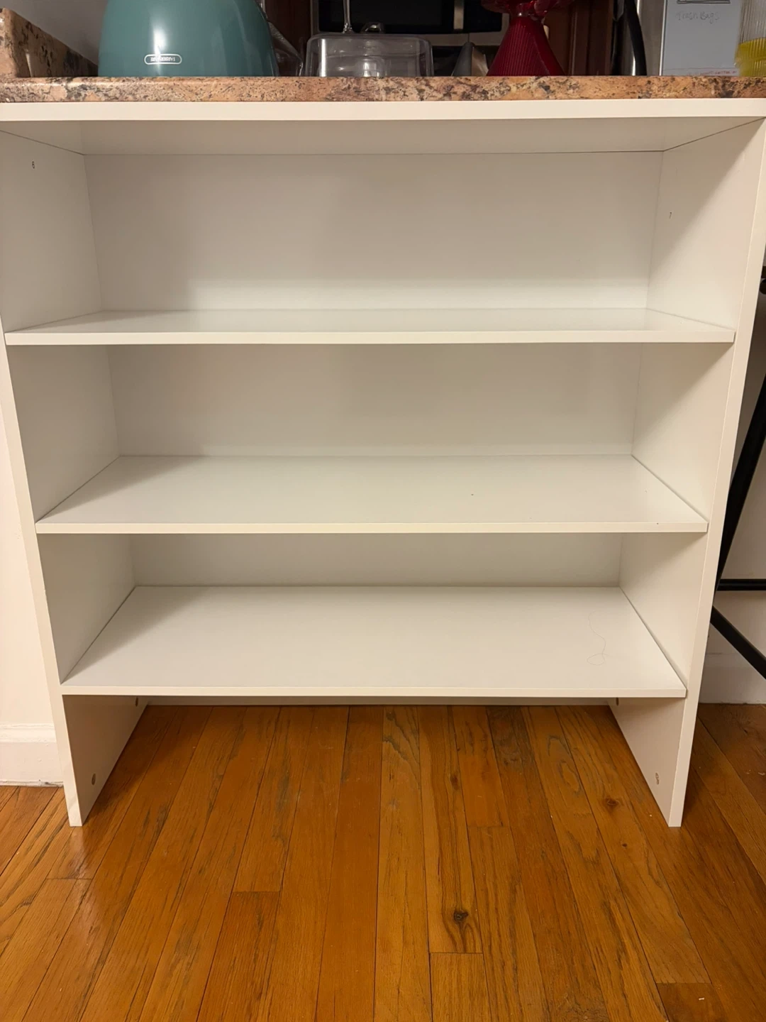 White 3-shelf bookcase. Particle board construction. Measures approximately 32" W x 33.5" H x 12.25" D. Used for storage or display.