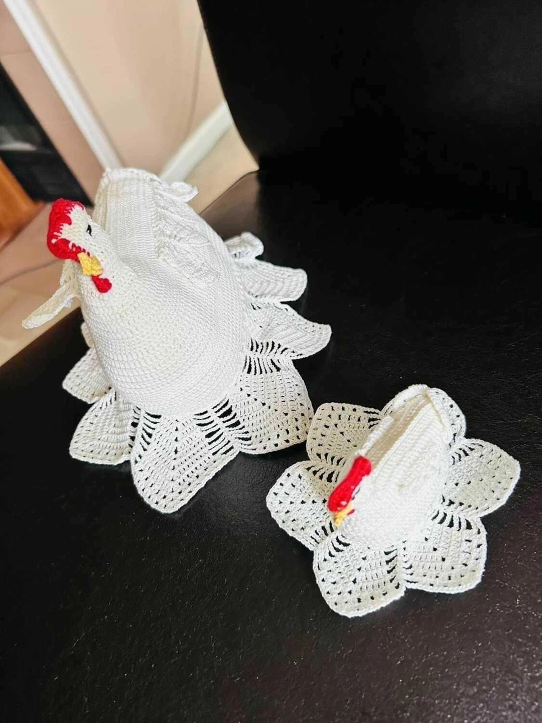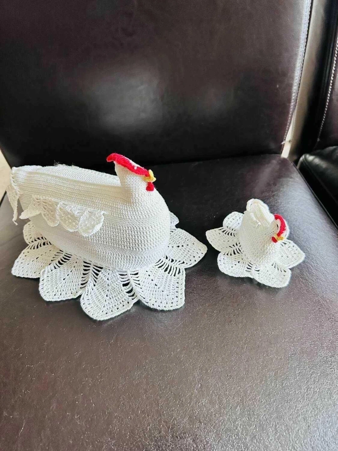 Set of two white crocheted chicken decorations. Each chicken sits on an attached decorative crocheted doily base. These would add a charming touch to any kitchen, sewing room or home decor!