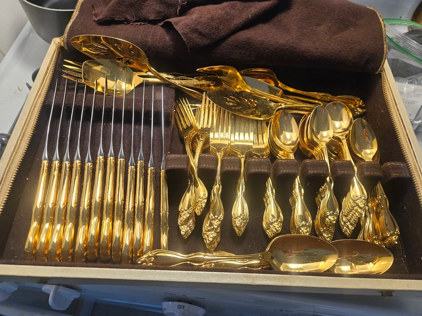 This set includes 80 (or more havent counted) gold-plated silverware over stainless steel. It comes in a zippered case lined with Pacific Silver Cloth.
