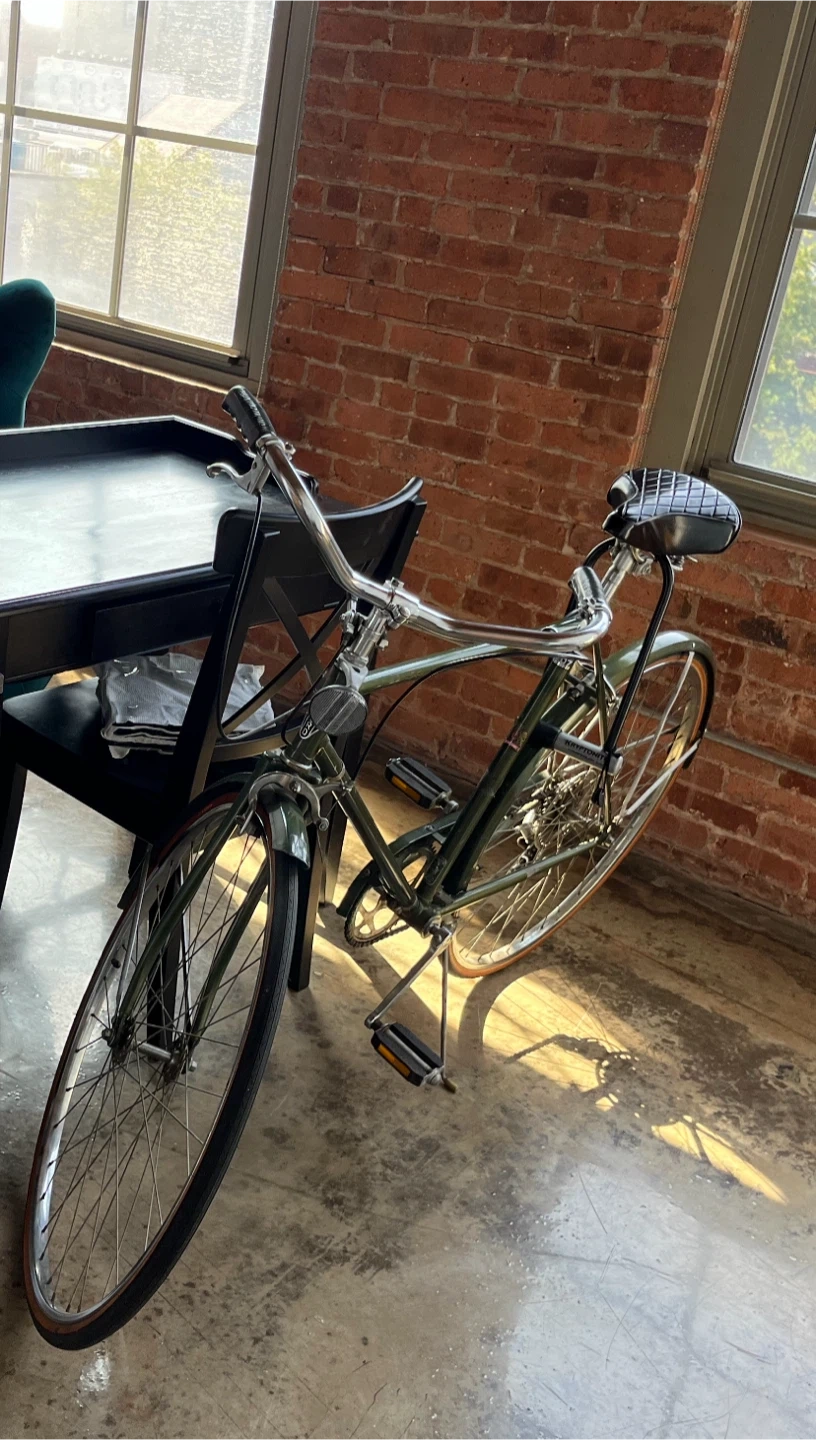 This is a classic cruiser bicycle with a dark green frame and comfortable seat. It features chrome handlebars and rims. This bike's design makes it great for relaxed rides.