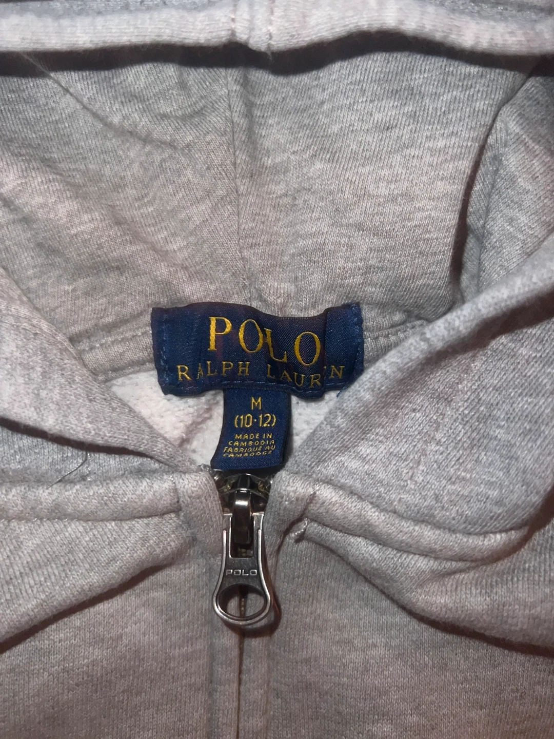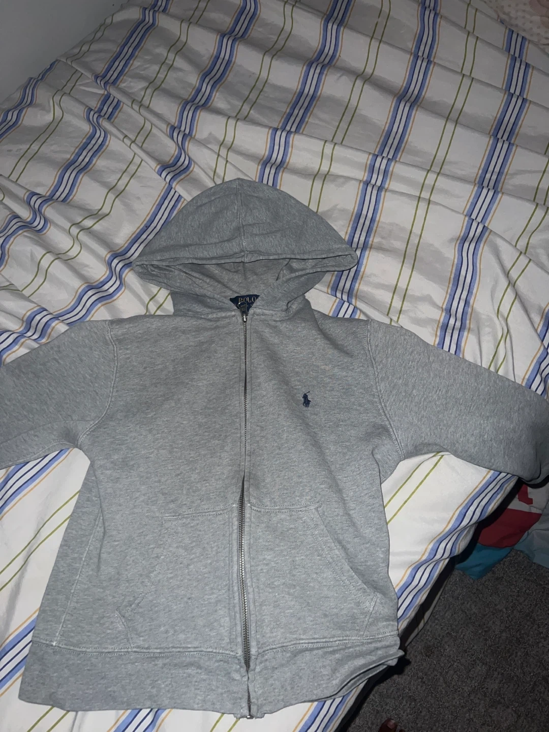 Grey zip-up hoodie by Polo Ralph Lauren. Size M (fits 10-12 years). Made from a cotton blend. Features a full zip closure and two front pockets. It's a classic staple for cooler weather!