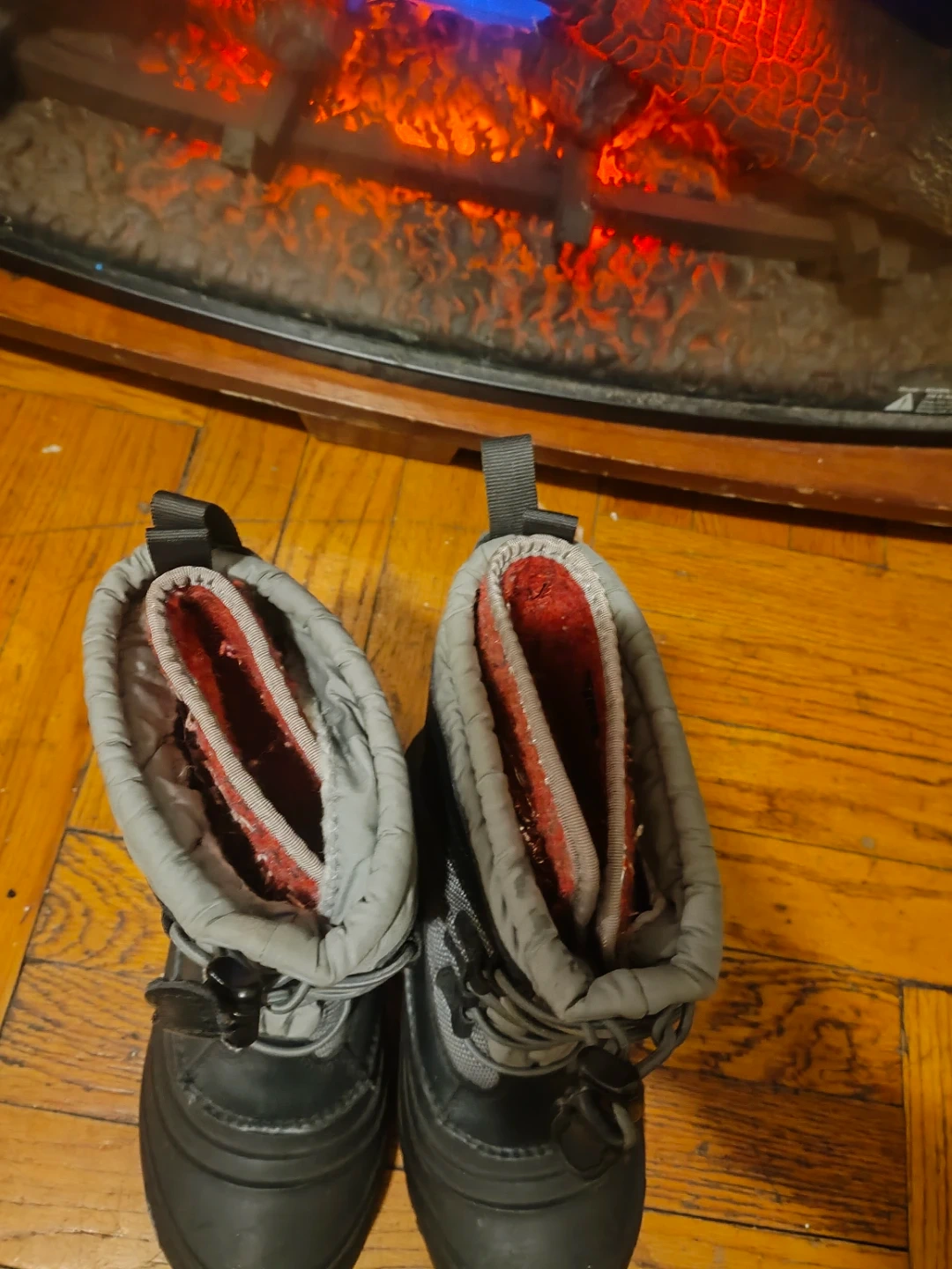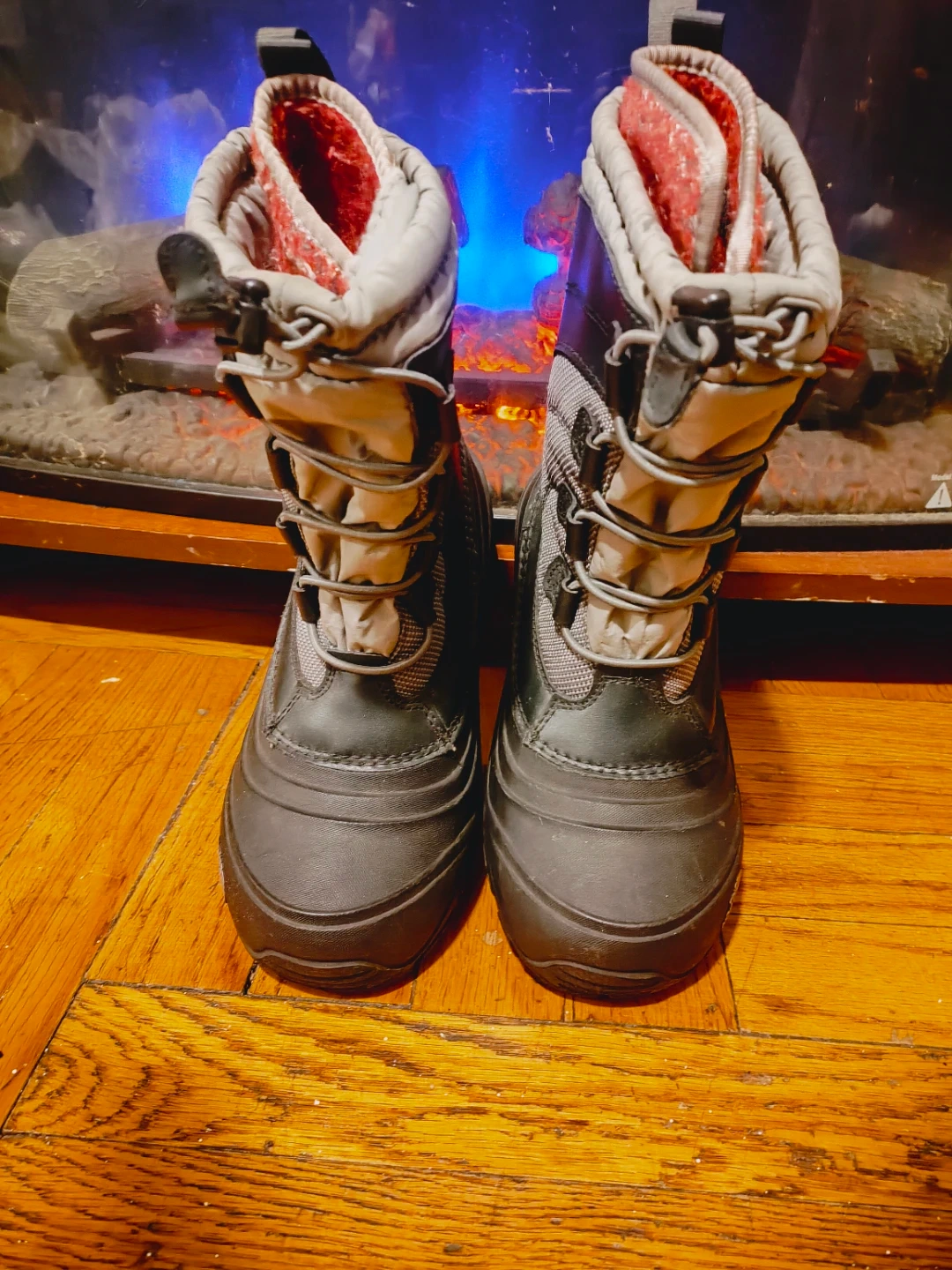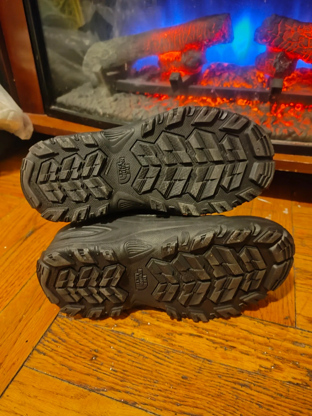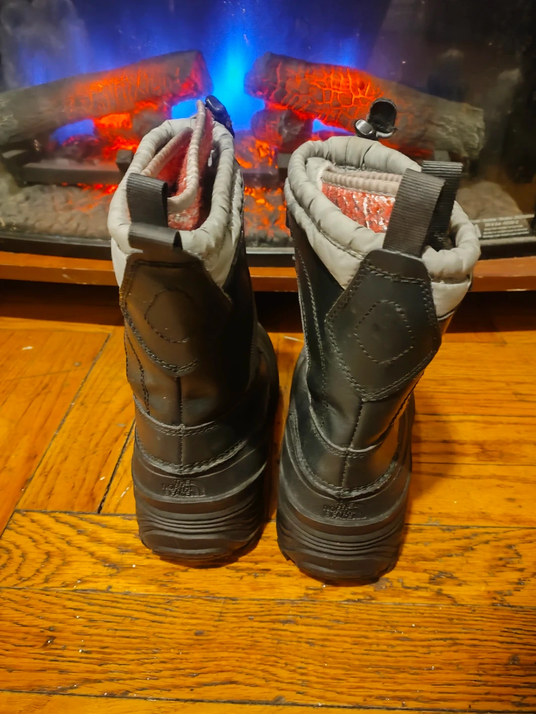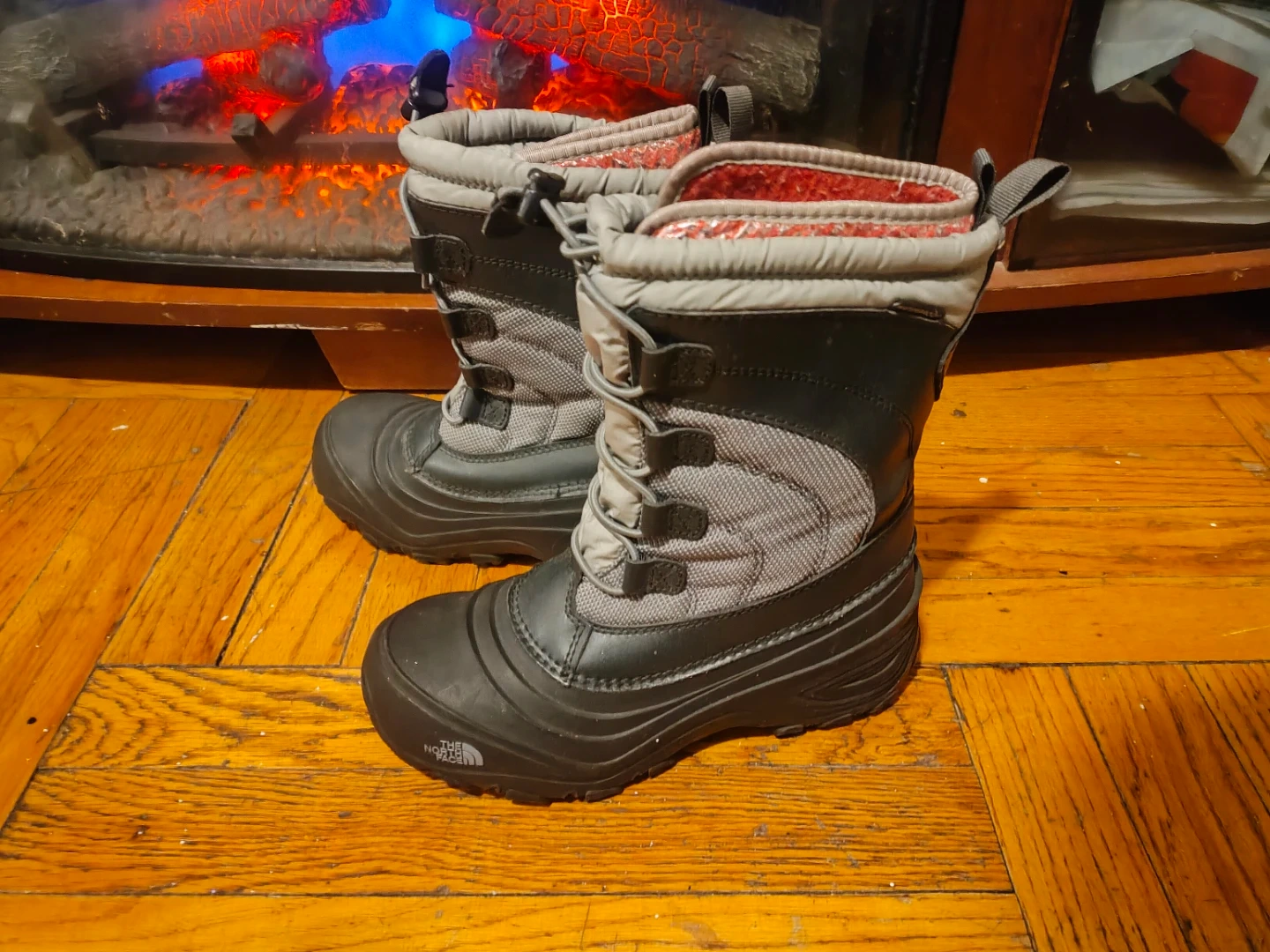 These are The North Face youth winter boots in black and gray. They feature a lace-up closure and a warm insulated interior. Size is 4.