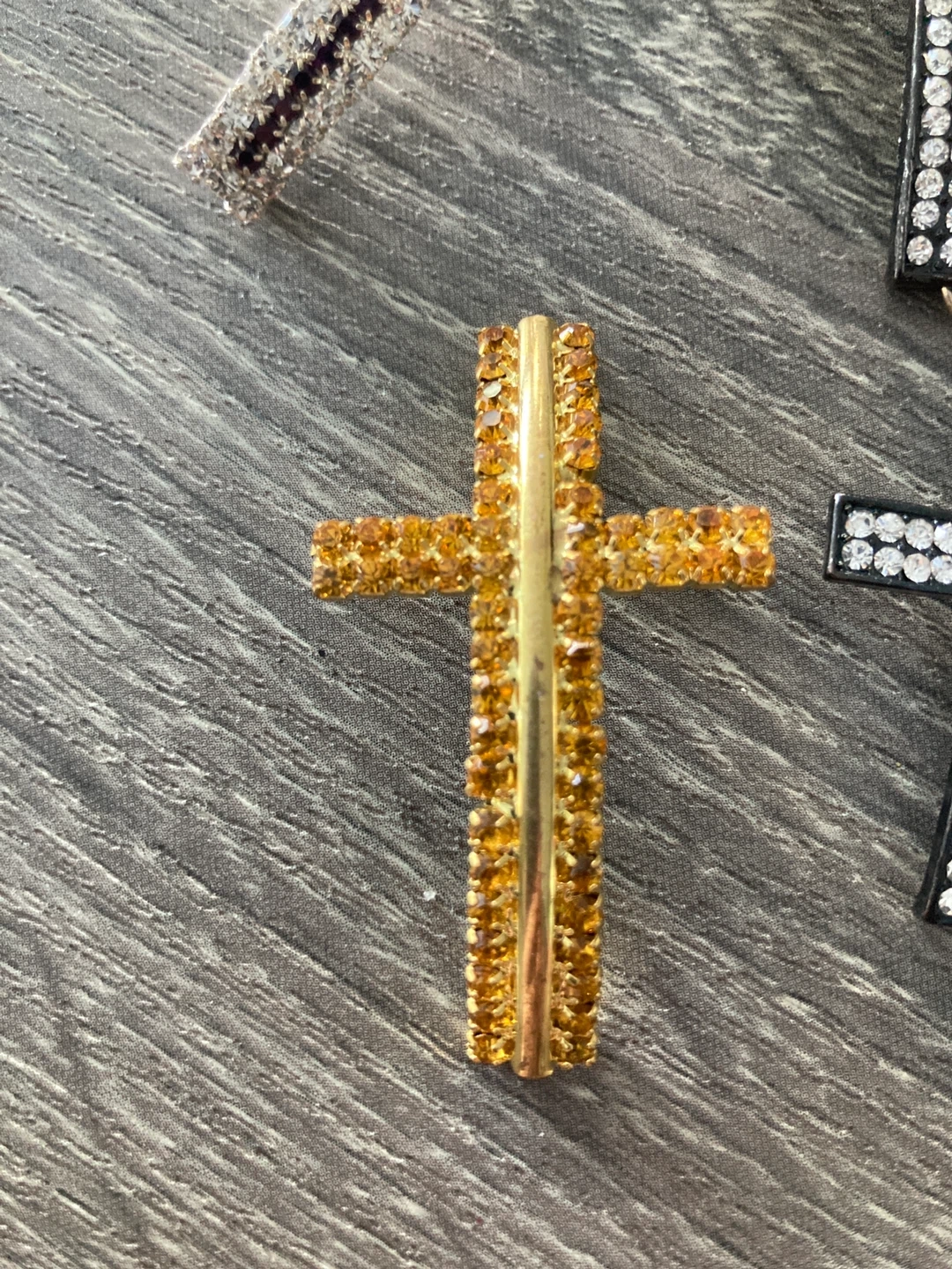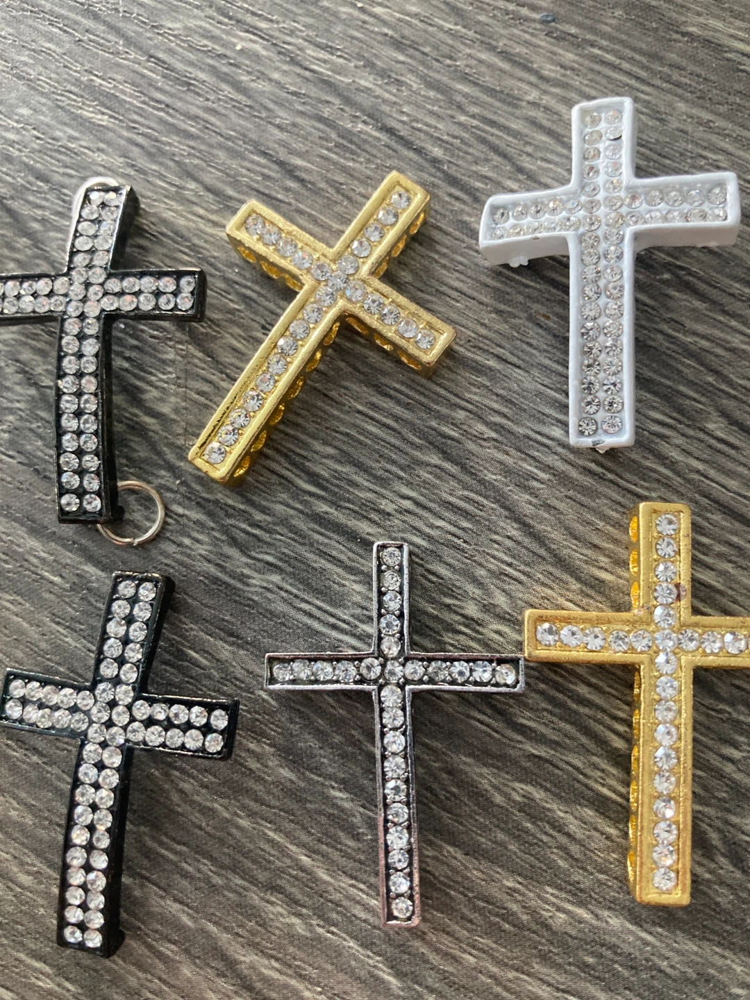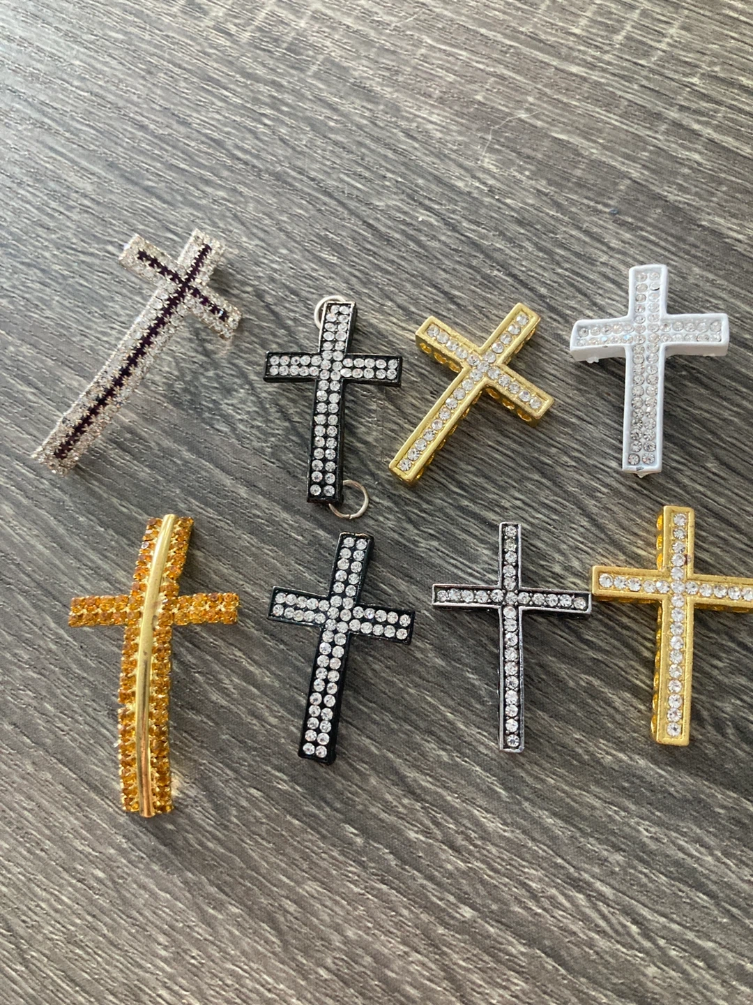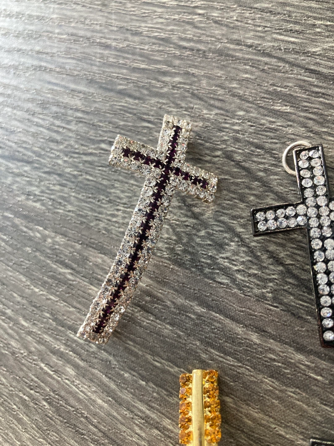This lot includes a variety of decorative cross charms adorned with rhinestones. Available in gold, silver, black, and white finishes. Some feature colourful accents like purple. They're perfect for crafting or as unique embellishments!