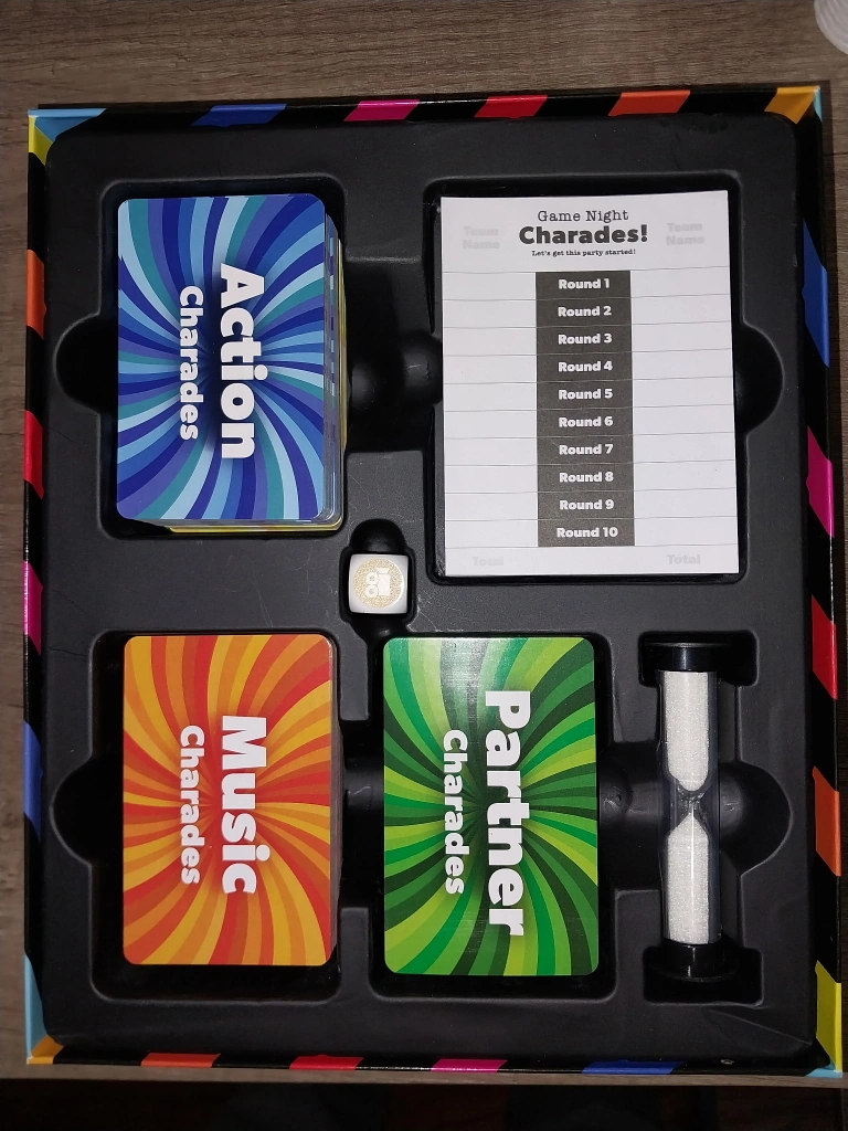 Get ready for a fun time with Game Night Charades! This board game is perfect for ages 14+ and can be played with 6+ players. It includes 280 cards with 1,120 prompts across 5 category decks, a 60-second timer, 1 dice, and a scorepad. This set also comes with a pencil and rules