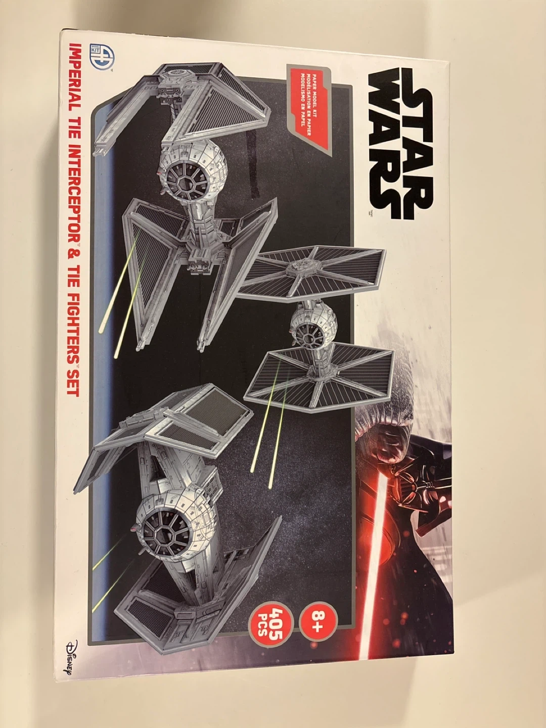 This is a Star Wars Imperial Tie Interceptor & Tie Fighters paper model kit. It includes 405 pieces and is recommended for ages 8 and up. Assembly required.