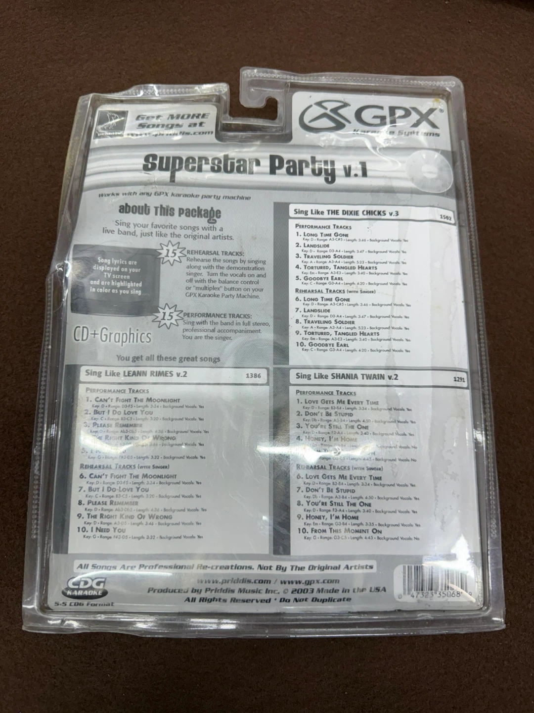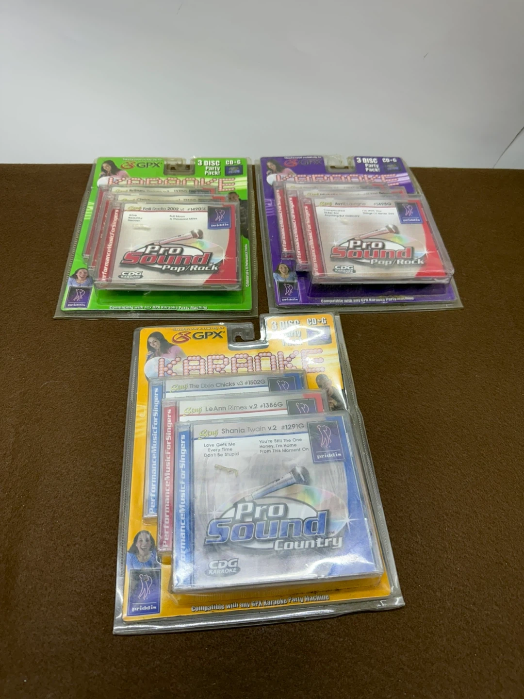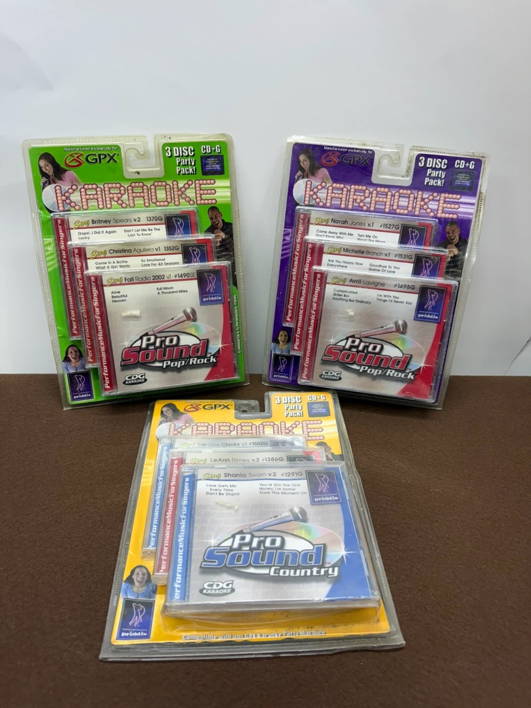 Three 3-disc CD+G karaoke party packs. Includes Pop/Rock volumes v.2, v.1, and Country volume v.1. These packs feature performance tracks with lyrics on screen. Compatible with any GPX karaoke party machine.
