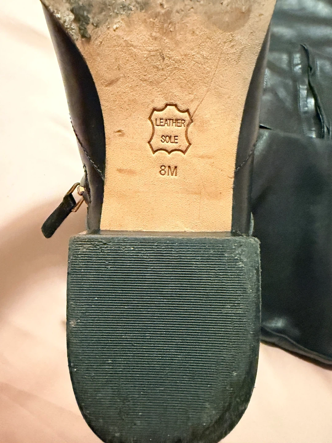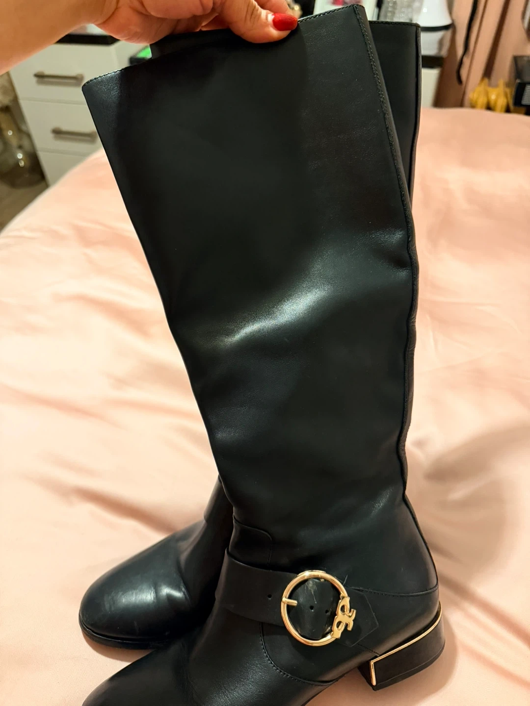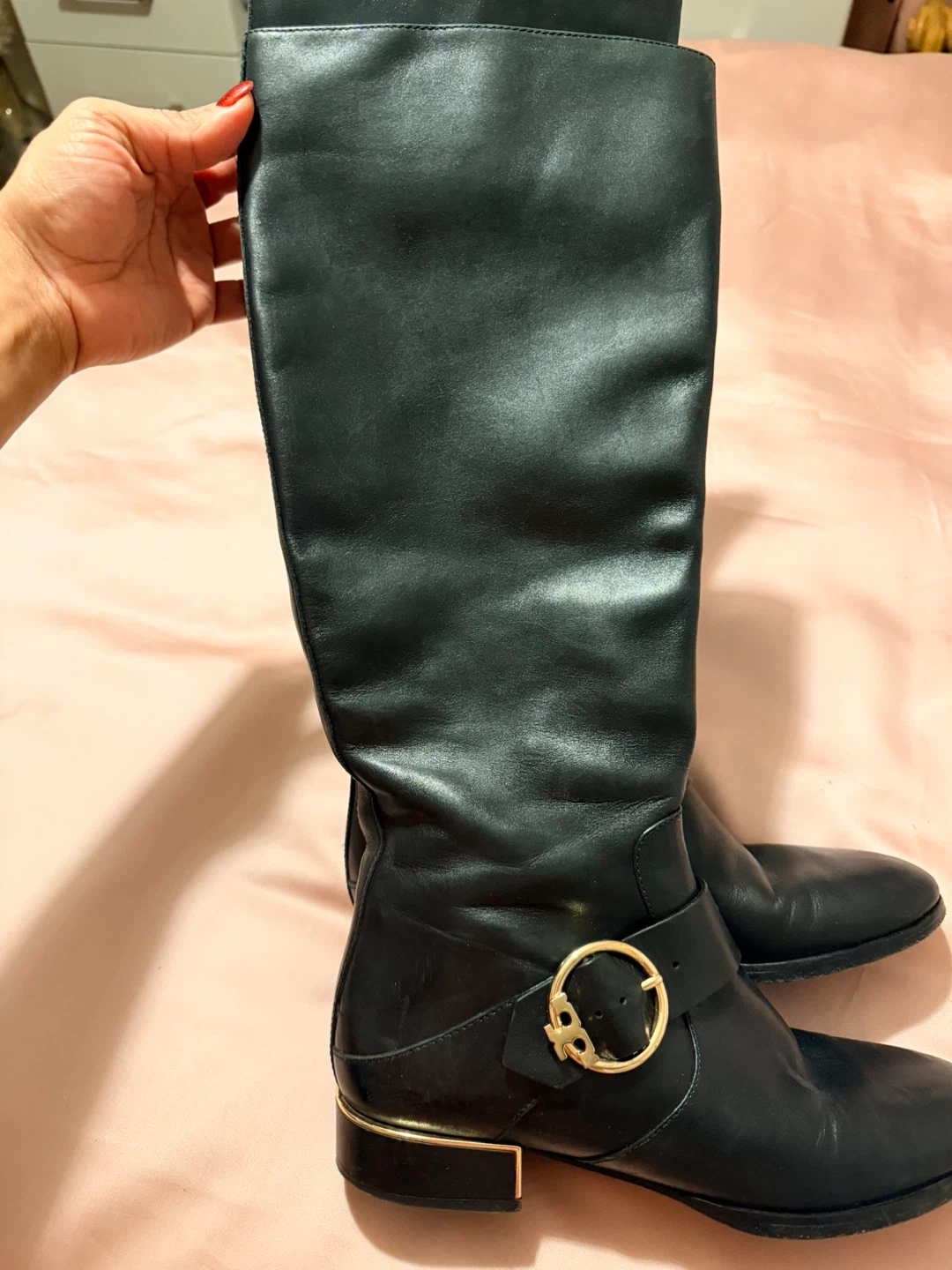 These Tory Burch are black leather knee-high boots with a stylish gold buckle accent. They feature a leather sole and a comfortable block heel. Size 8M.