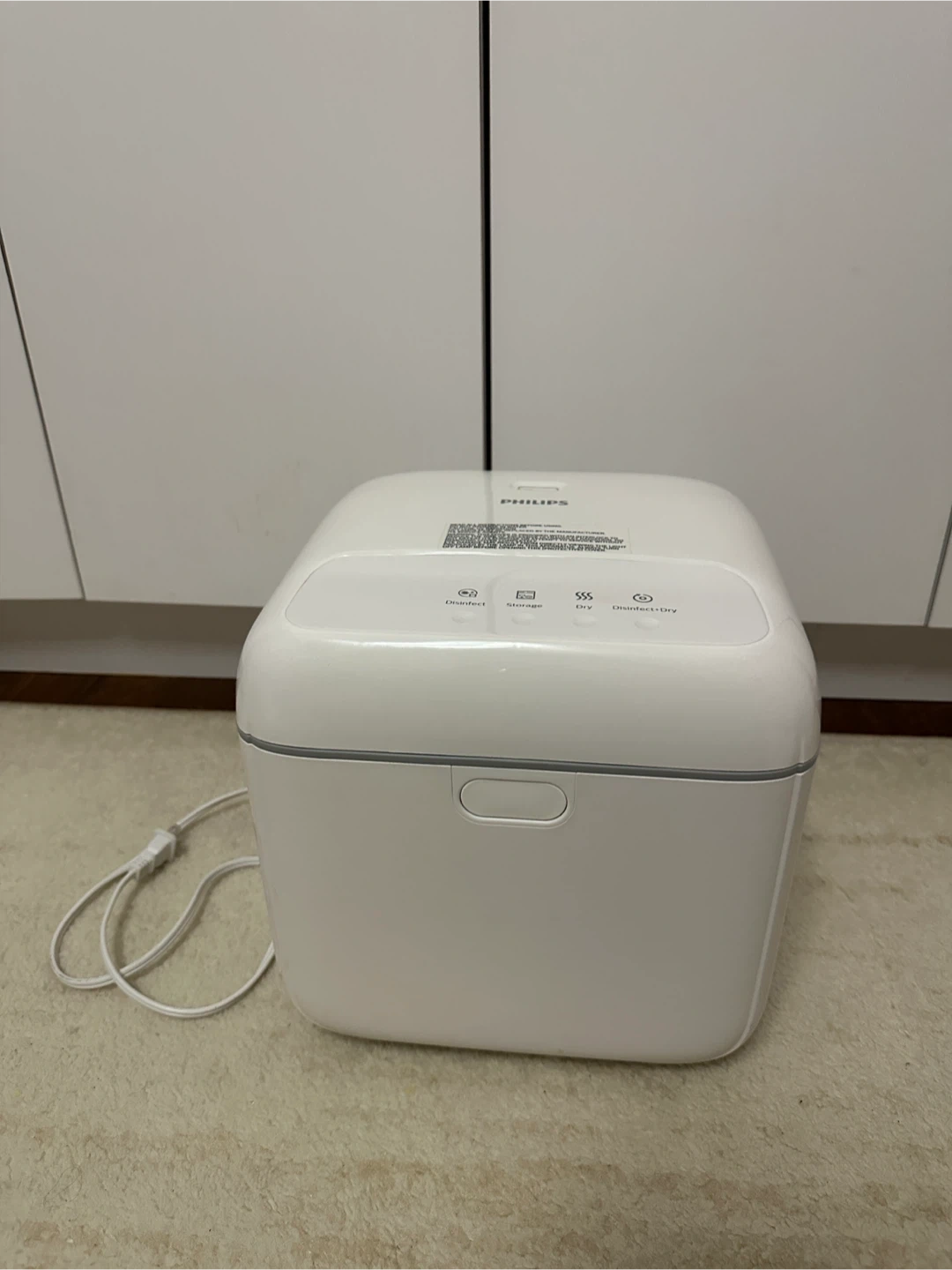 This Philips UV sterilizer box is white and grey. It's designed for disinfecting and drying items. The interior is stainless steel and includes a drying rack.