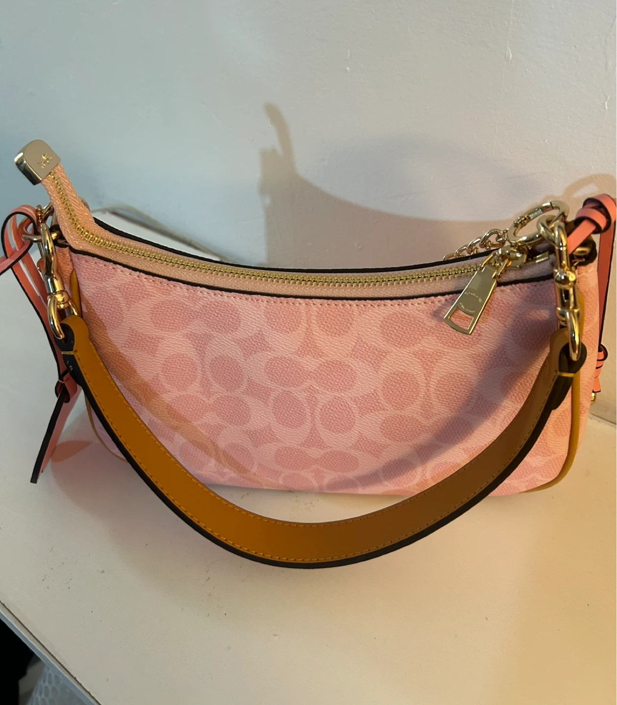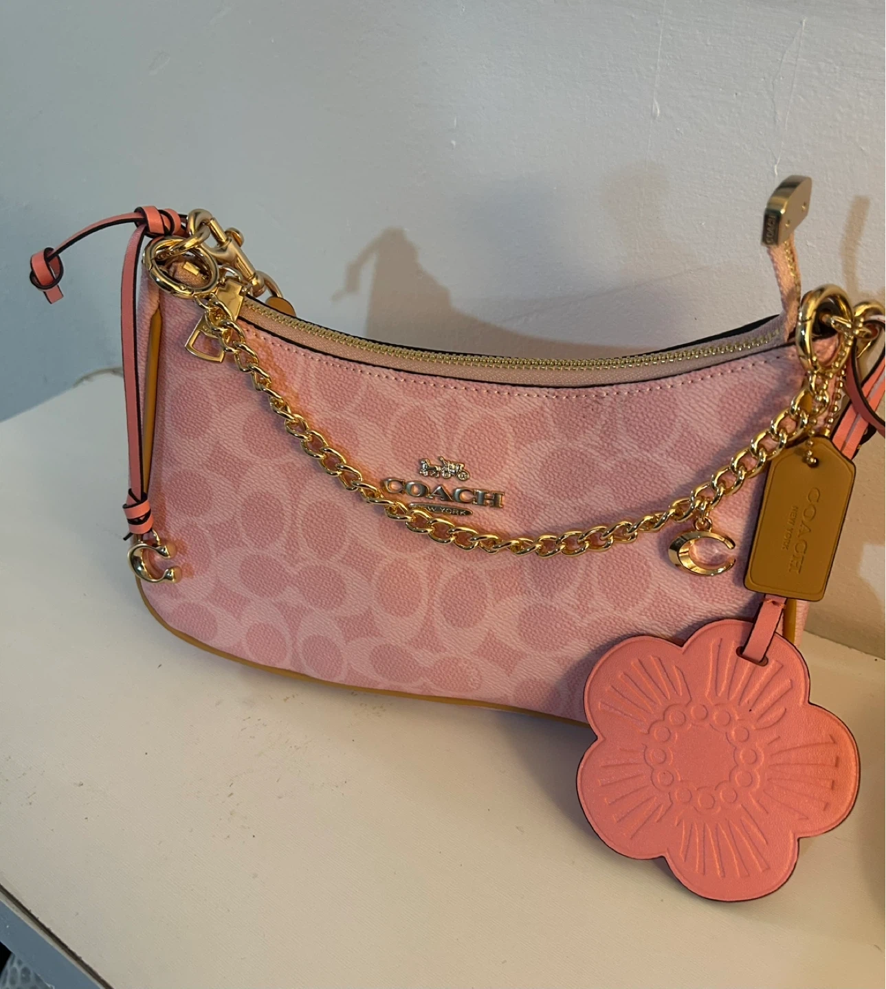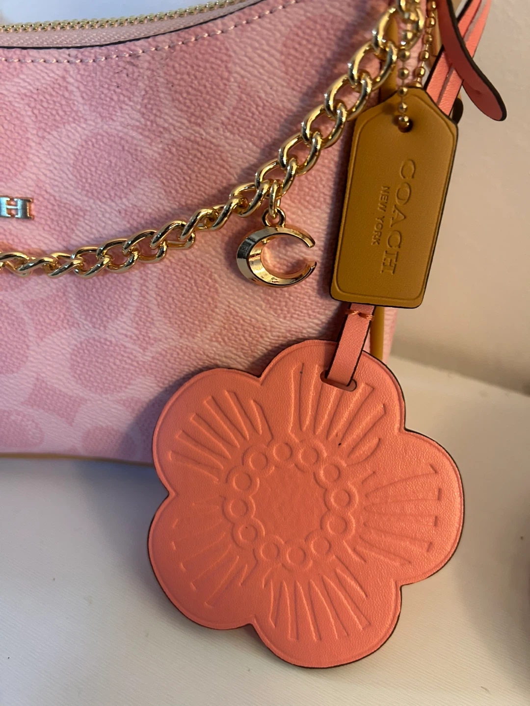This is a pink shoulder bag featuring the signature monogram pattern. It has gold-tone hardware and a flower-shaped charm. The bag's strap is adjustable.