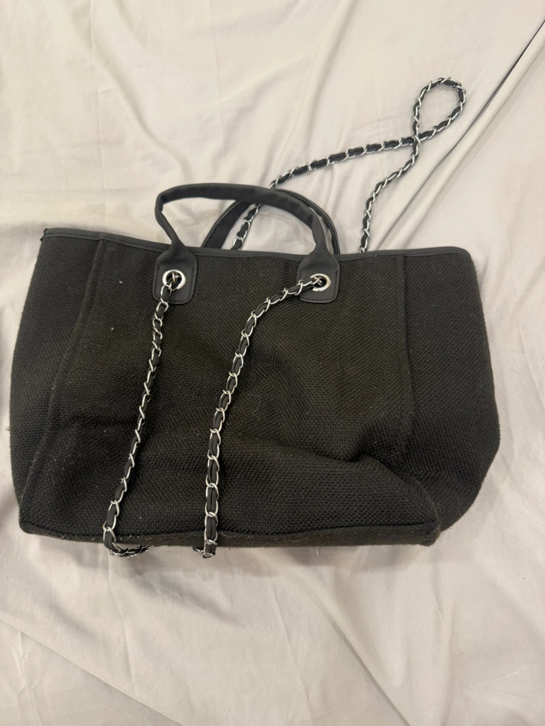 Here's a stylish black tote bag up for grabs! It features chain straps for a bit of edge. It's in great condition and ready for a new owner!