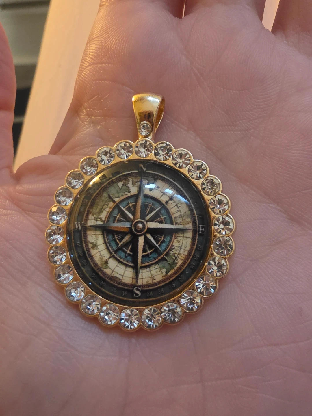 This gold-tone pendant features a detailed compass design. It's encrusted with clear faux gemstones around the edge. Great for adding a touch of adventure to your outfit!