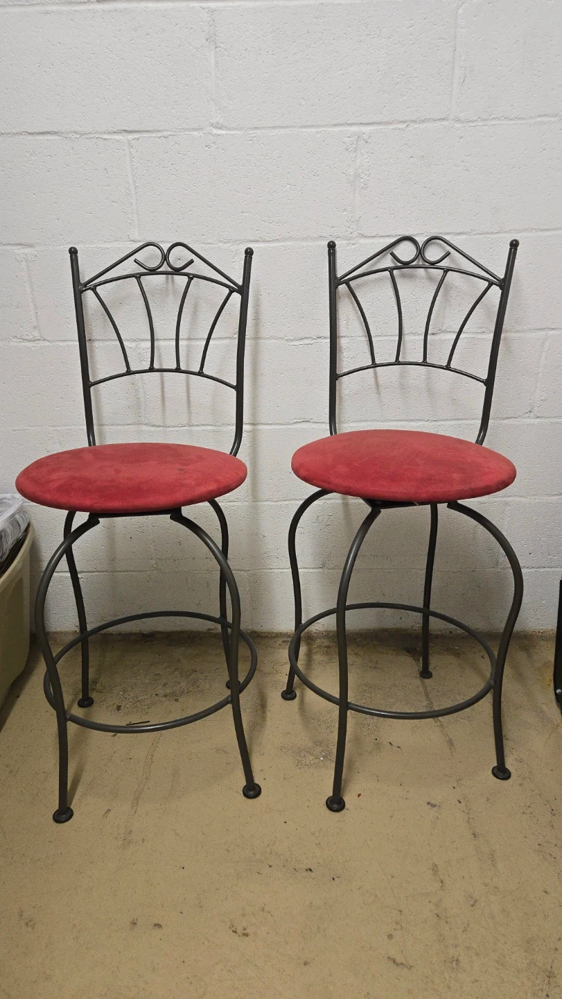 This listing is for a set of two bar stools. Each stool features a red upholstered, swivel seat and a black metal frame with decorative scrollwork on the backrest. The frame is made of metal. These stools would add a touch of style to your kitchen counter or home bar!