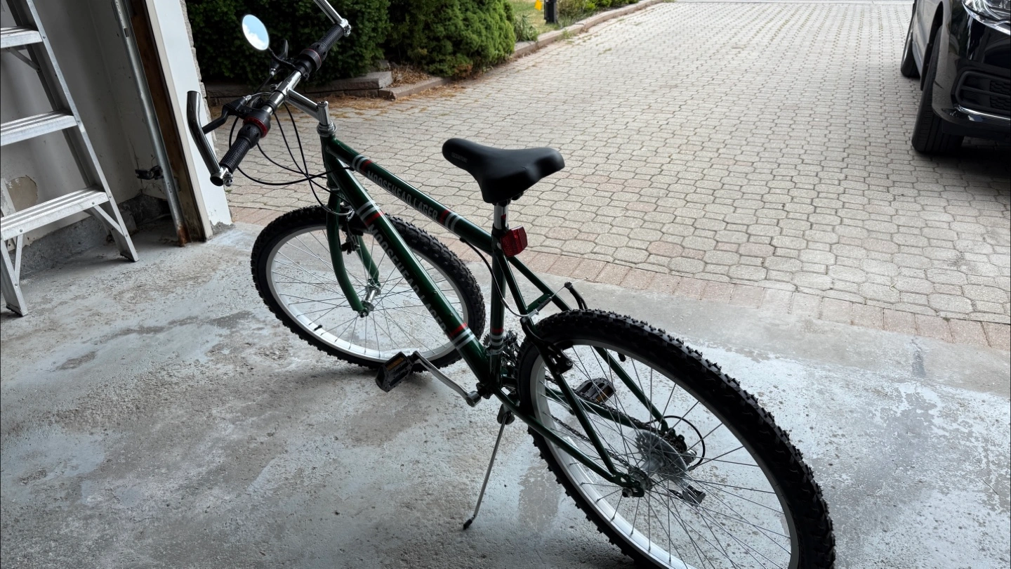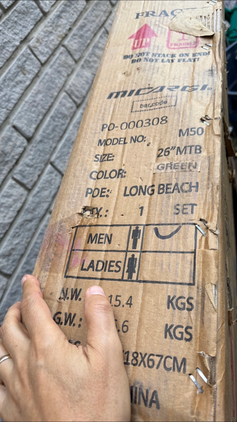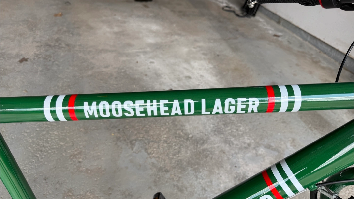 Selling a Micargi Moosehead Lager mountain bike! It's a 26" MTB in green, perfect for cruising around town or hitting some trails. The box indicates the weight is around 15.4 kg.