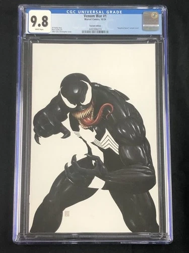 The Venom War #1 Christopher Variant comic book featuring artwork by John Tyler Christopher. This negative space variant cover showcases the character Venom in the Marvel Universe, published by Marvel Comics in 2024. Graded at 9.8 Near Mint/Mint by Certified Guaranty Company (CGC). Let me know if you're interested!