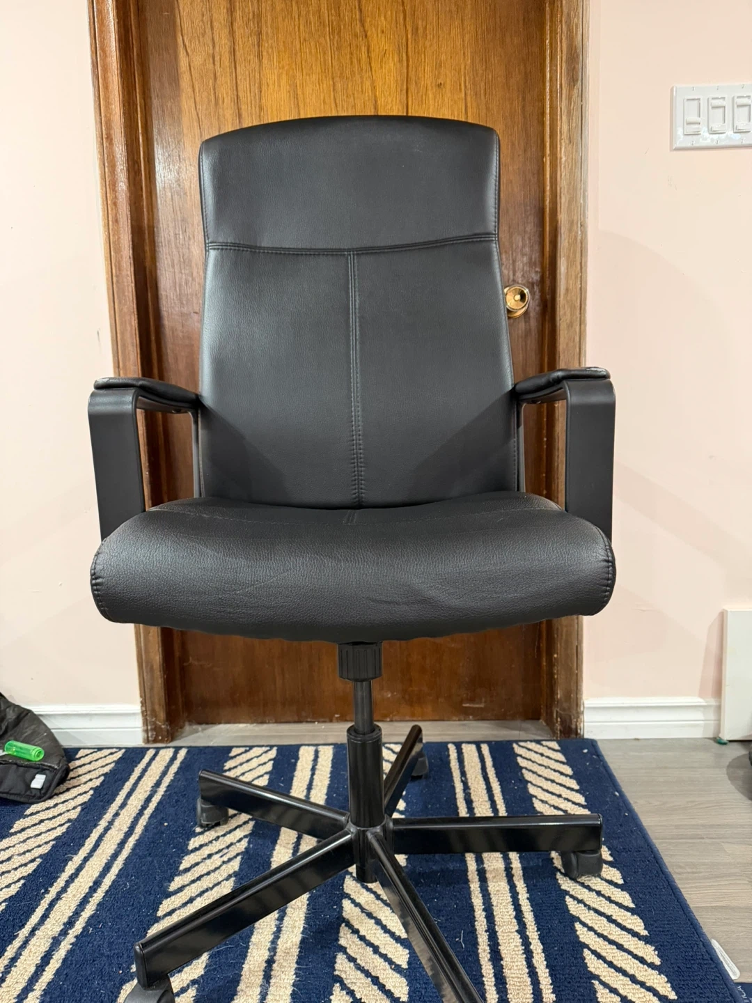 Selling a comfortable black office chair! It's in good shape and ready for a new workspace. The chair features a high back for support. It has a sturdy base with wheels for easy movement. Perfect for your home office or study space.