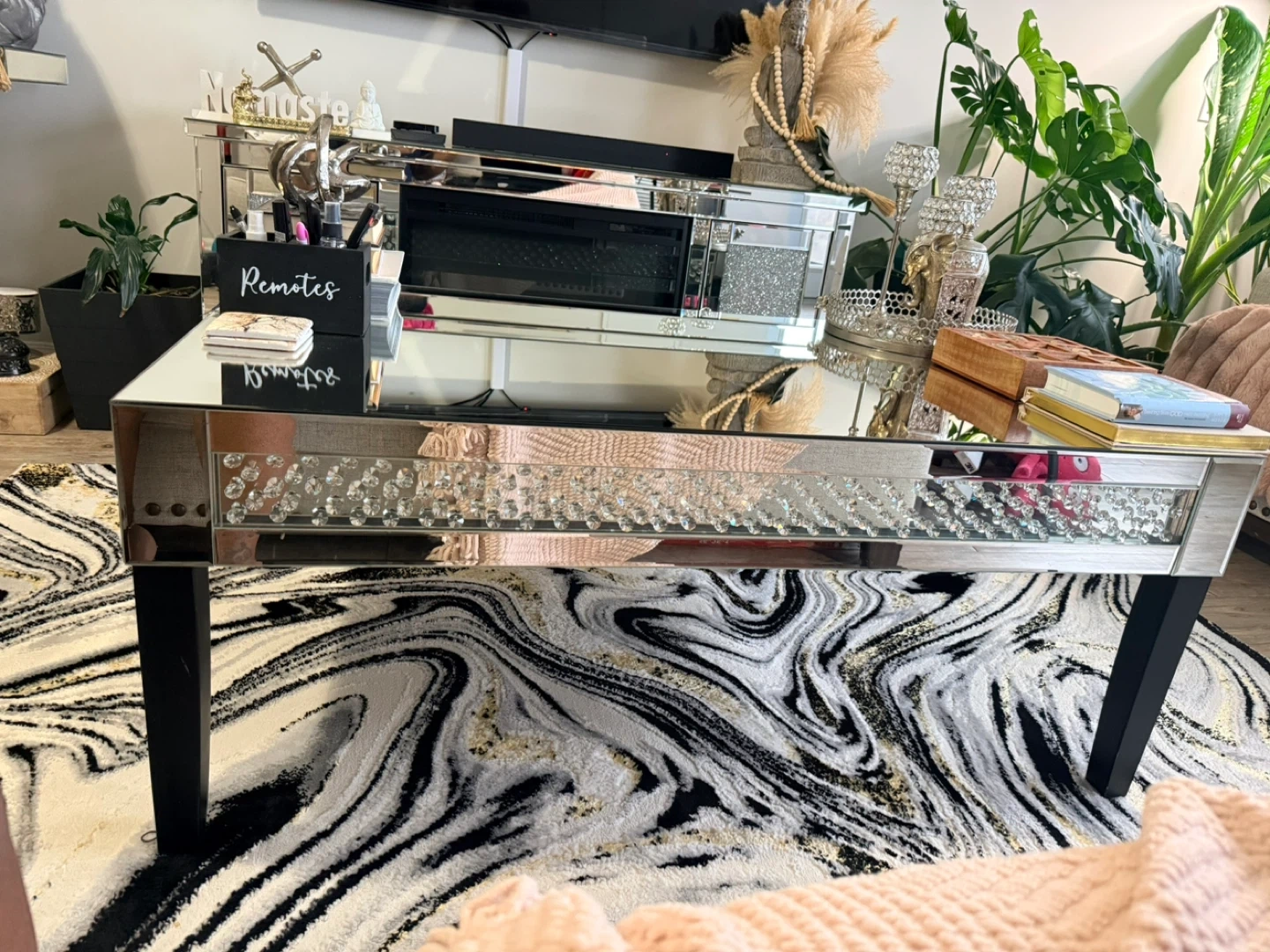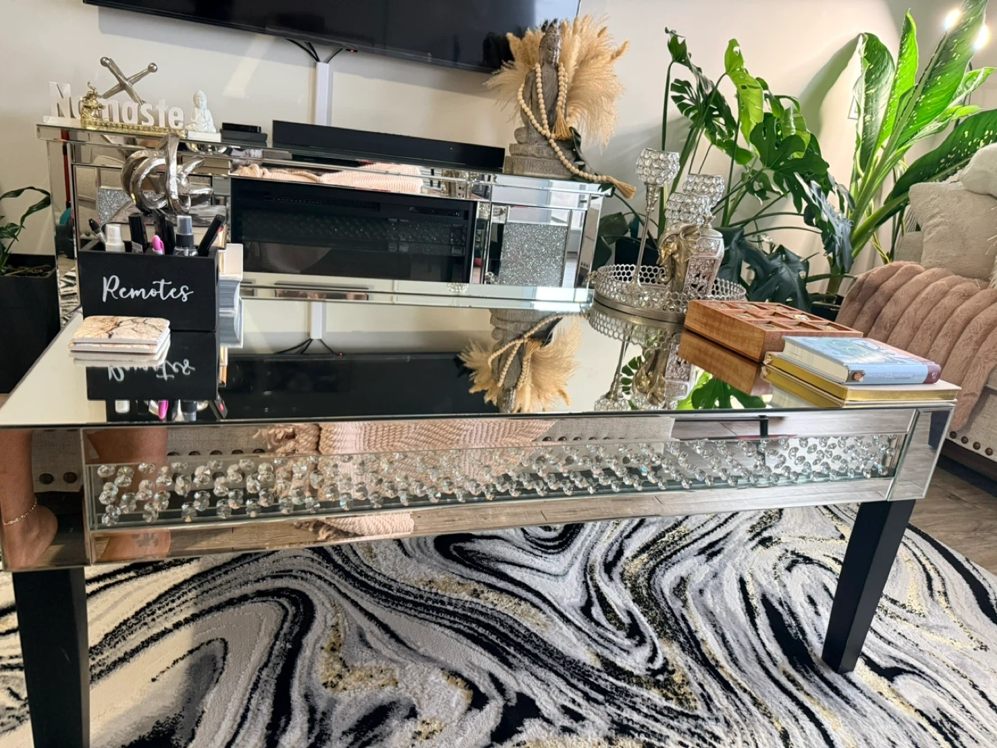 This coffee table features a mirrored finish with a decorative inlay of clear crystals. It has a modern design with a sleek mirrored top and sides. The table has black wooden legs for support.