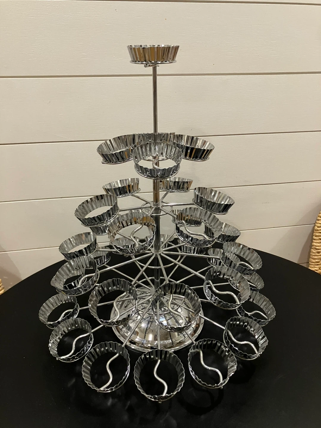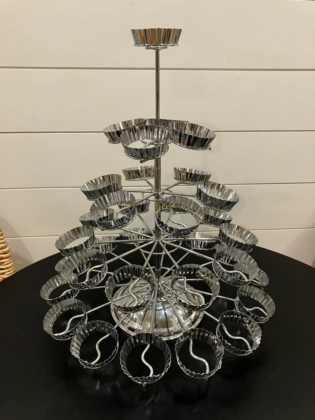 Selling a metal cupcake stand! It's perfect for displaying cupcakes or other treats at parties or events. It has multiple tiers and can hold 35 cupcakes. It's in great condition and ready to use