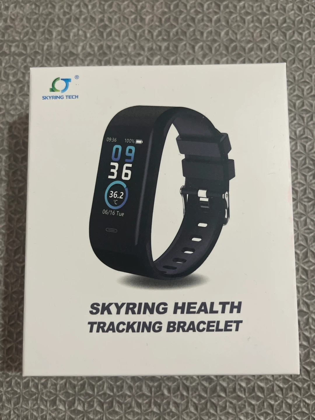 This is the Skyring Health Tracking Bracelet. It's a black fitness band with a digital display. It shows time, date, and body temperature.
