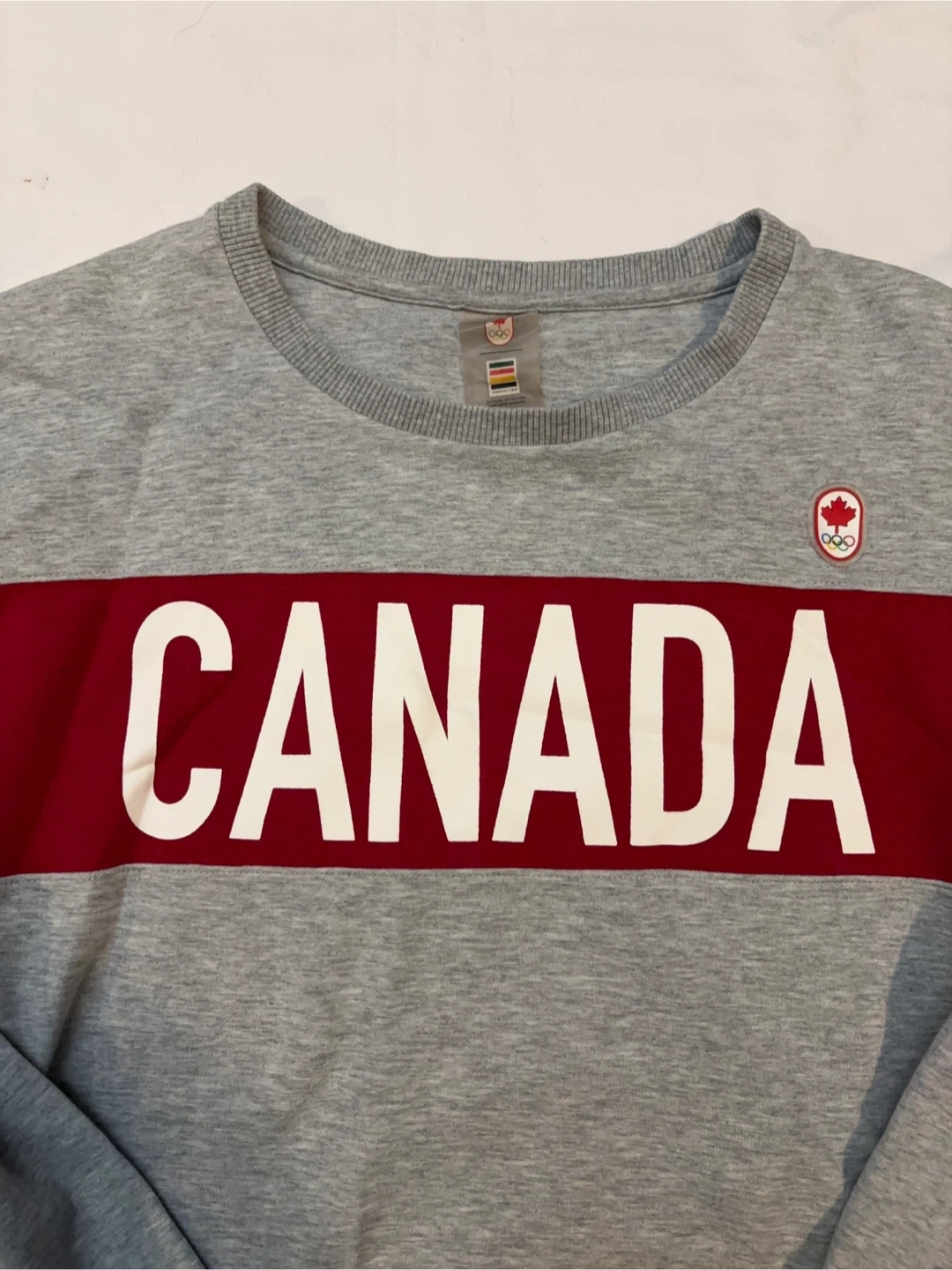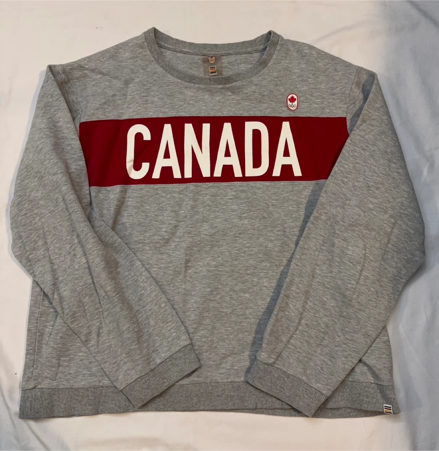 Classic grey crewneck sweatshirt with a bold red chest panel and large white CANADA lettering. Comfortable cotton-blend fabric for everyday wear. Ribbed cuffs and hem for a secure fit. Ideal casual staple in grey and red. $30 cash, porch pick up Kennedy and Eglinton.