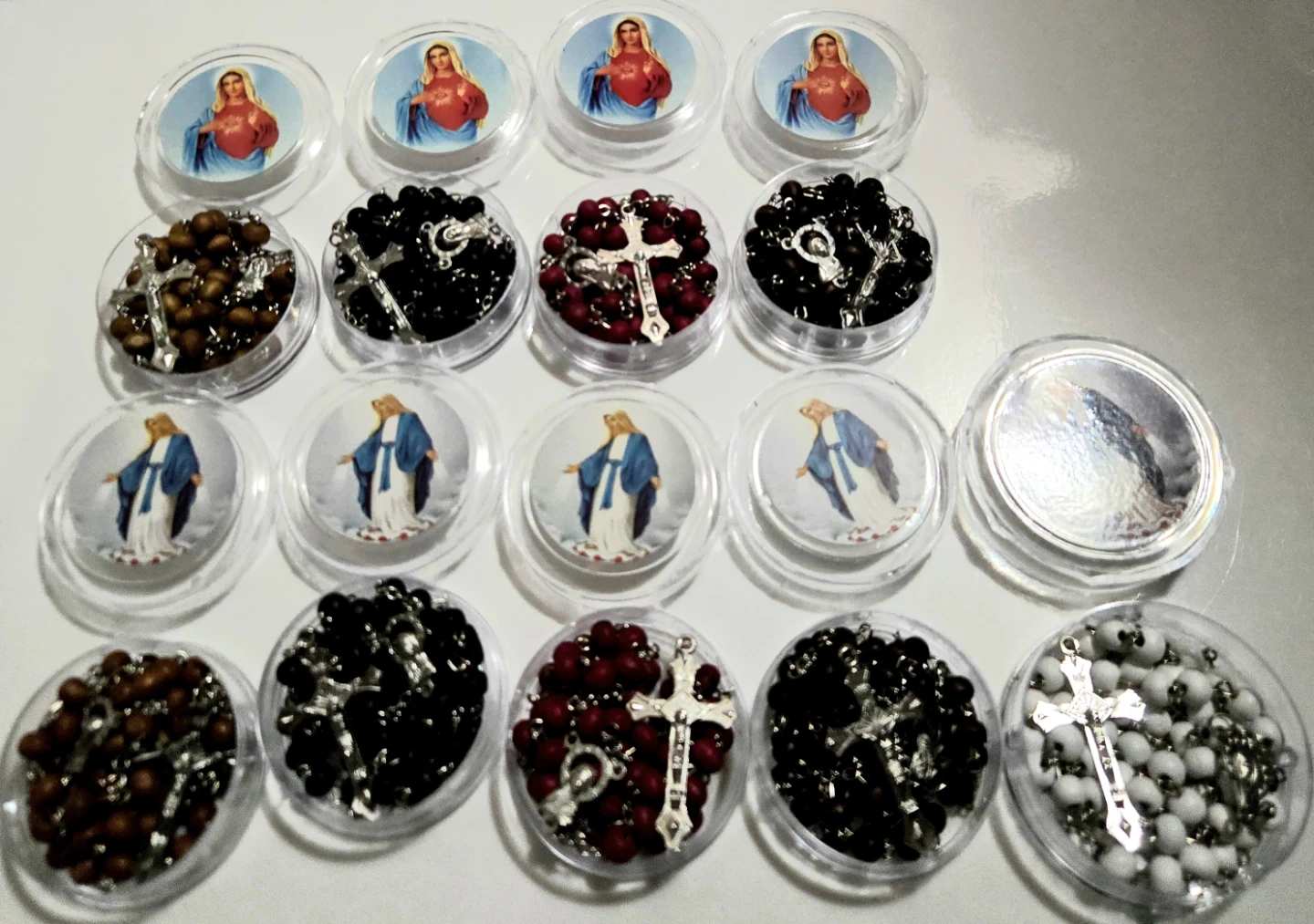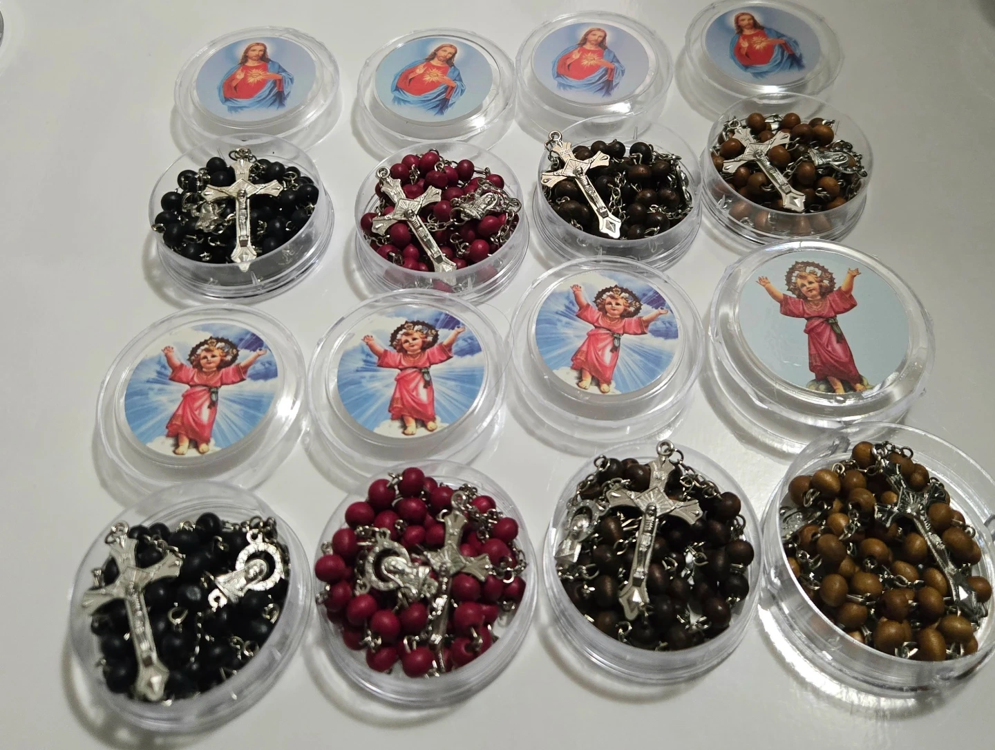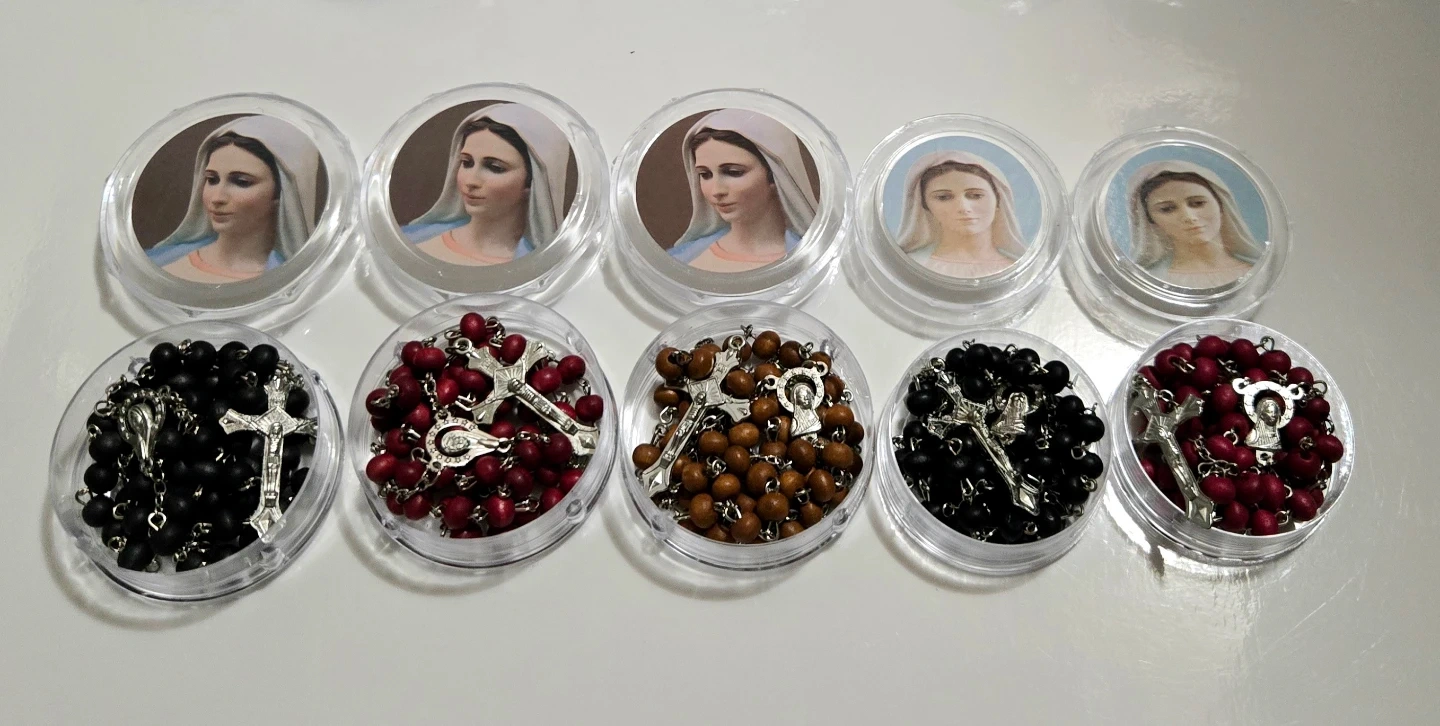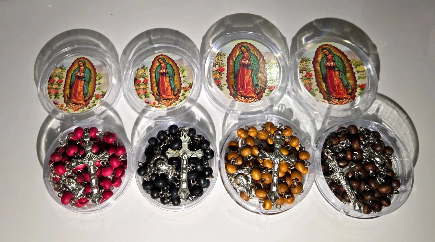 Scented rosaries, each in its own clear plastic case. Various colors of beads such as brown, light brown, black, red, and white are present. Each case features a religious image. Great for sharing or as individual gifts!